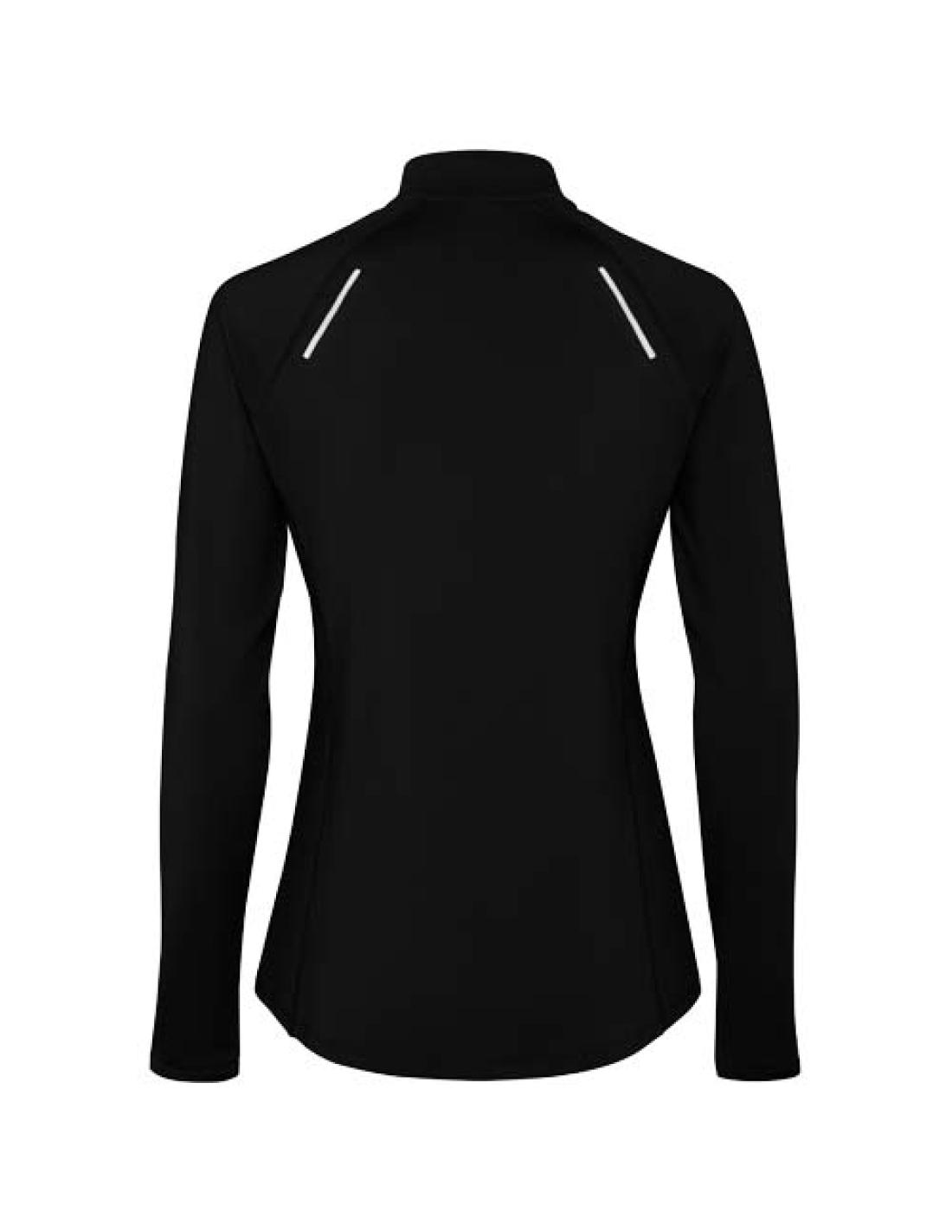Sudadera técnica de manga larga raglán para mujer. Corte ajustado. Cuello con diseño invertido de media cremallera con elementos reflectantes. Cubiertas de costuras reforzadas. Puños con aberturas para el pulgar. Elementos reflectantes en la espalda. Dobladillo trasero ligeramente más largo que el delantero. Cálido tejido interior cepillado.