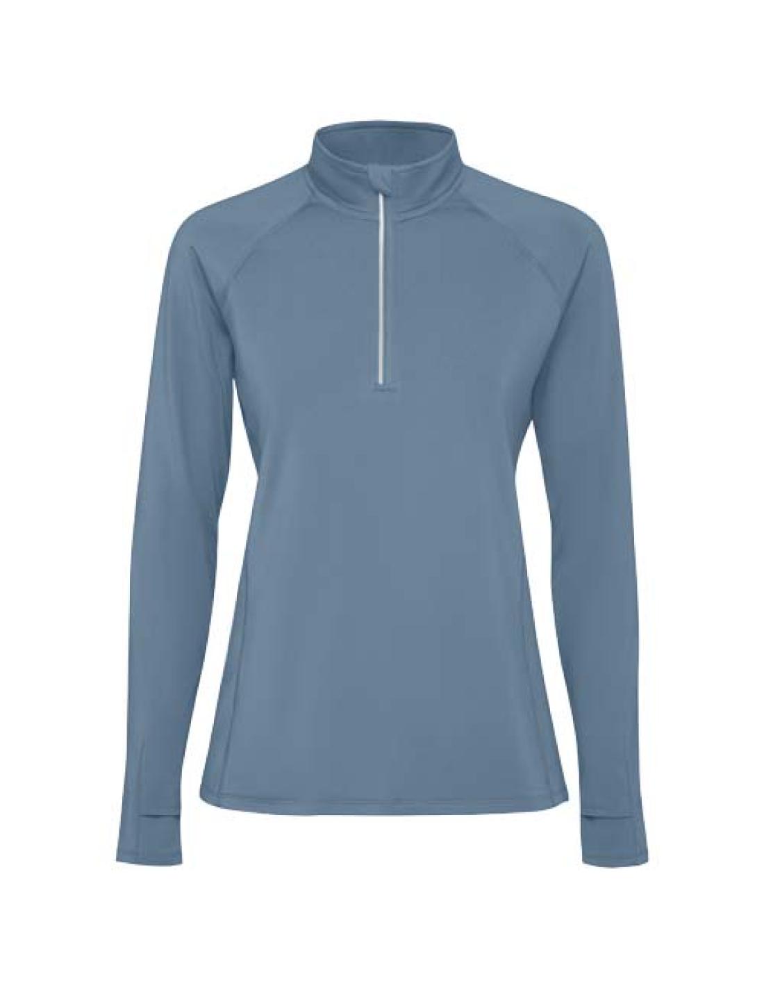 Sudadera técnica de manga larga raglán para mujer. Corte ajustado. Cuello con diseño invertido de media cremallera con elementos reflectantes. Cubiertas de costuras reforzadas. Puños con aberturas para el pulgar. Elementos reflectantes en la espalda. Dobladillo trasero ligeramente más largo que el delantero. Cálido tejido interior cepillado.