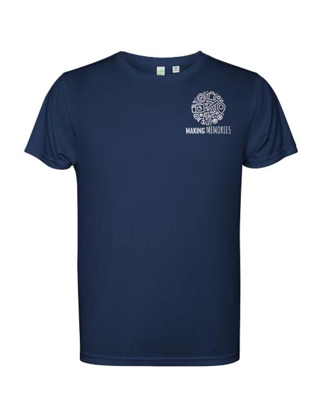 Camiseta técnica de manga corta infantil. Cuello con costuras a juego. Dobladillo trasero ligeramente más largo que el delantero. Costuras laterales desplazadas hacia delante.