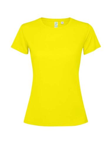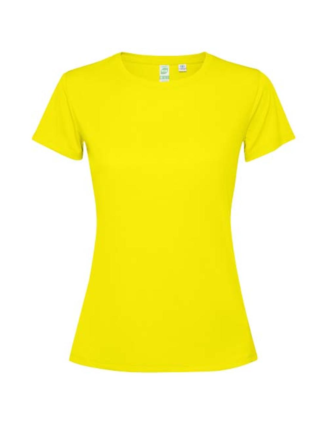 Camiseta técnica entallada de manga corta para mujer. Cuello con costuras a juego. Dobladillo trasero ligeramente más largo que el delantero. Costuras laterales desplazadas hacia delante.