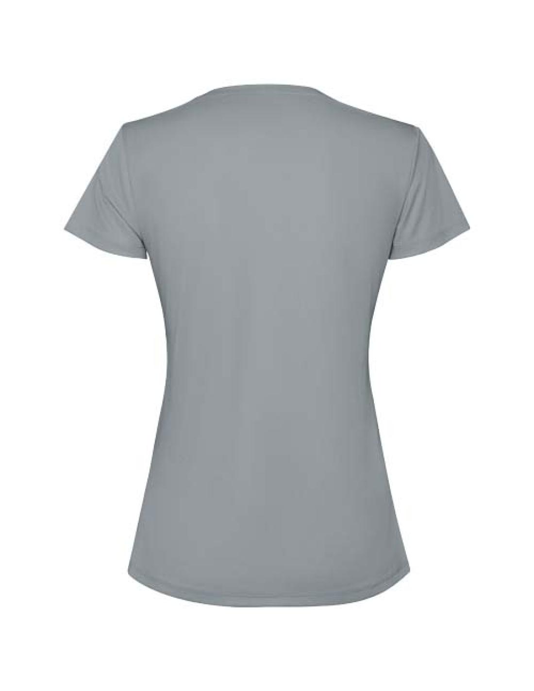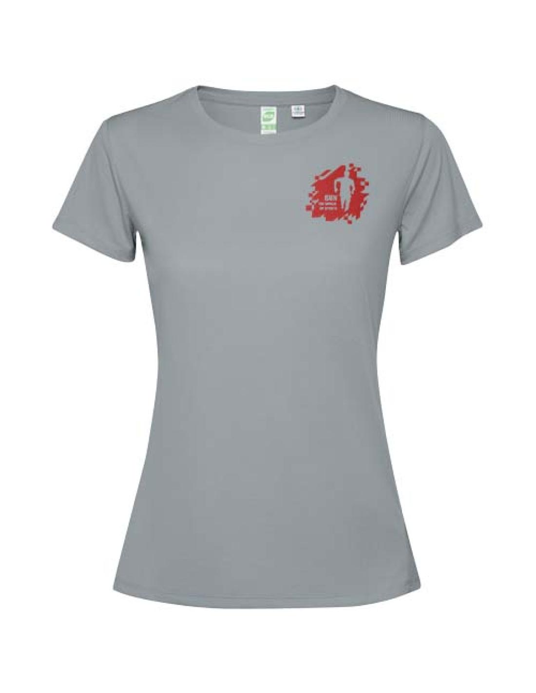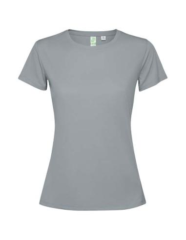 Camiseta técnica entallada de manga corta para mujer. Cuello con costuras a juego. Dobladillo trasero ligeramente más largo que el delantero. Costuras laterales desplazadas hacia delante.