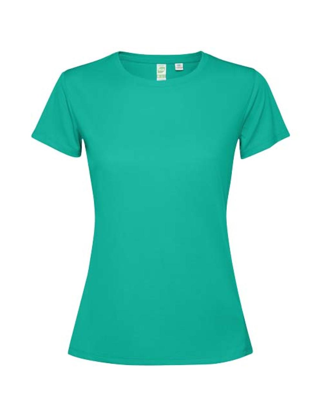 Camiseta técnica entallada de manga corta para mujer. Cuello con costuras a juego. Dobladillo trasero ligeramente más largo que el delantero. Costuras laterales desplazadas hacia delante.