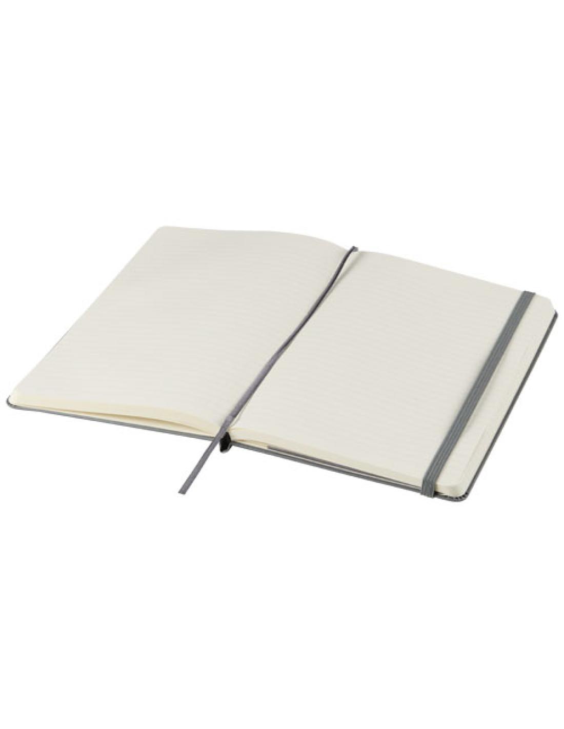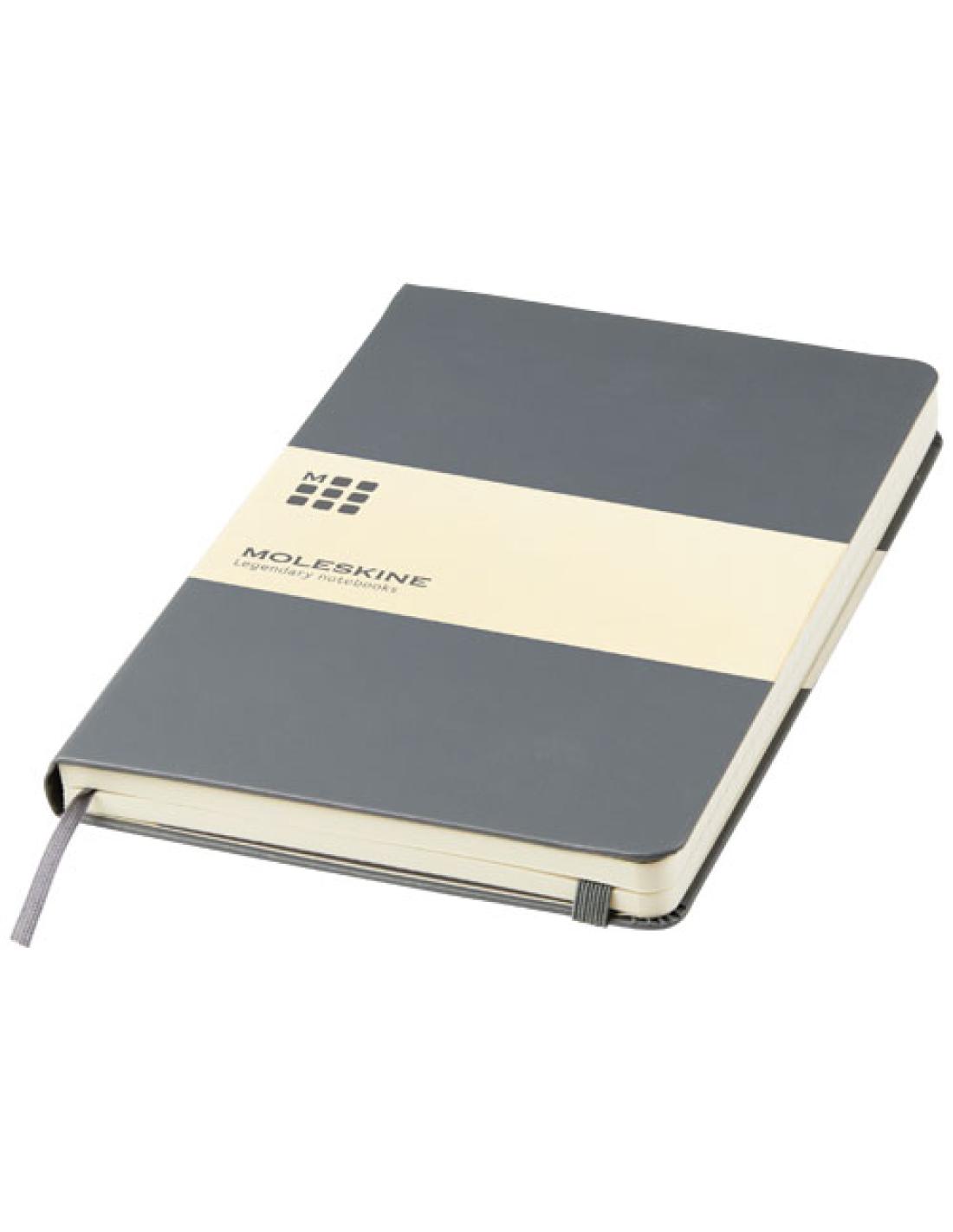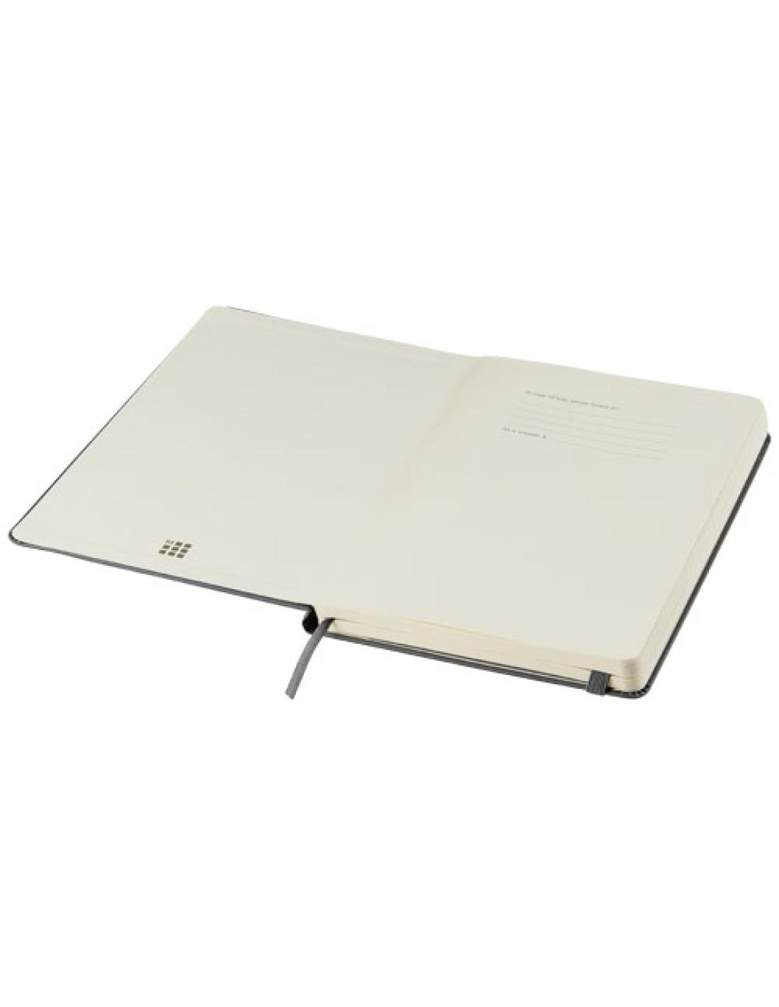 La libreta de tapa dura "Moleskine Classic" grande (13 x 21 cm) cuenta con una tapa encuadernada de cartón con esquinas redondeadas, papel libre de ácido, un marcador de cinta y un cierre elástico. En la primera página hay una advertencia de «En caso de pérdida», con espacio para anotar una recompensa para quien lo encuentre. Unido a la cubierta posterior, hay un bolsillo interior extensible que incluye la historia de "Moleskine". El bolsillo se puede utilizar para papeles sueltos y notas. Contiene 240 páginas rayadas de color marfil. Disponible en una amplia gama de elegantes colores .