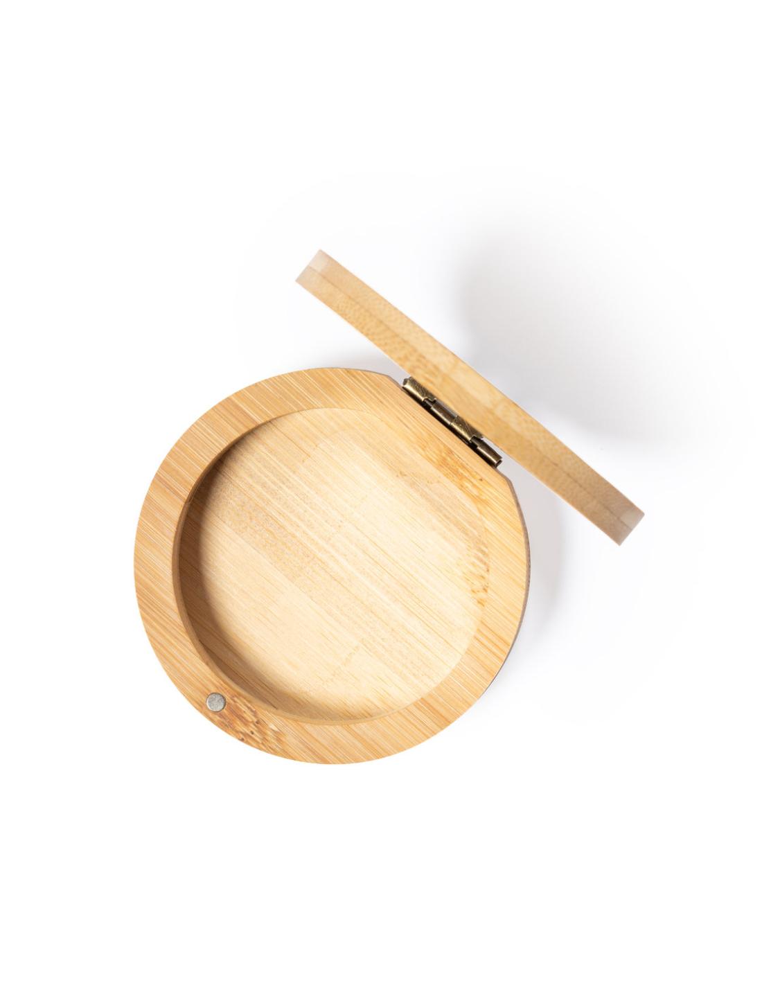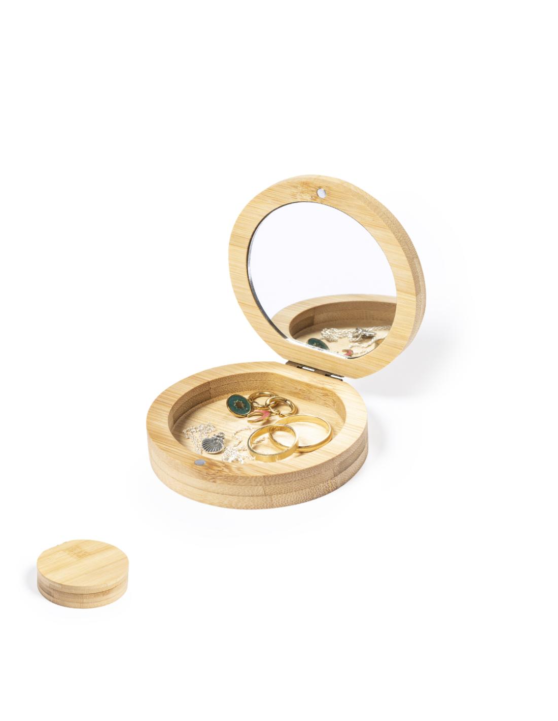 Joyero de línea nature, con carcasa fabricada en bambú. Con espejo interior 1X y cierre magnético. Presentado en caja individual de diseño kraft.