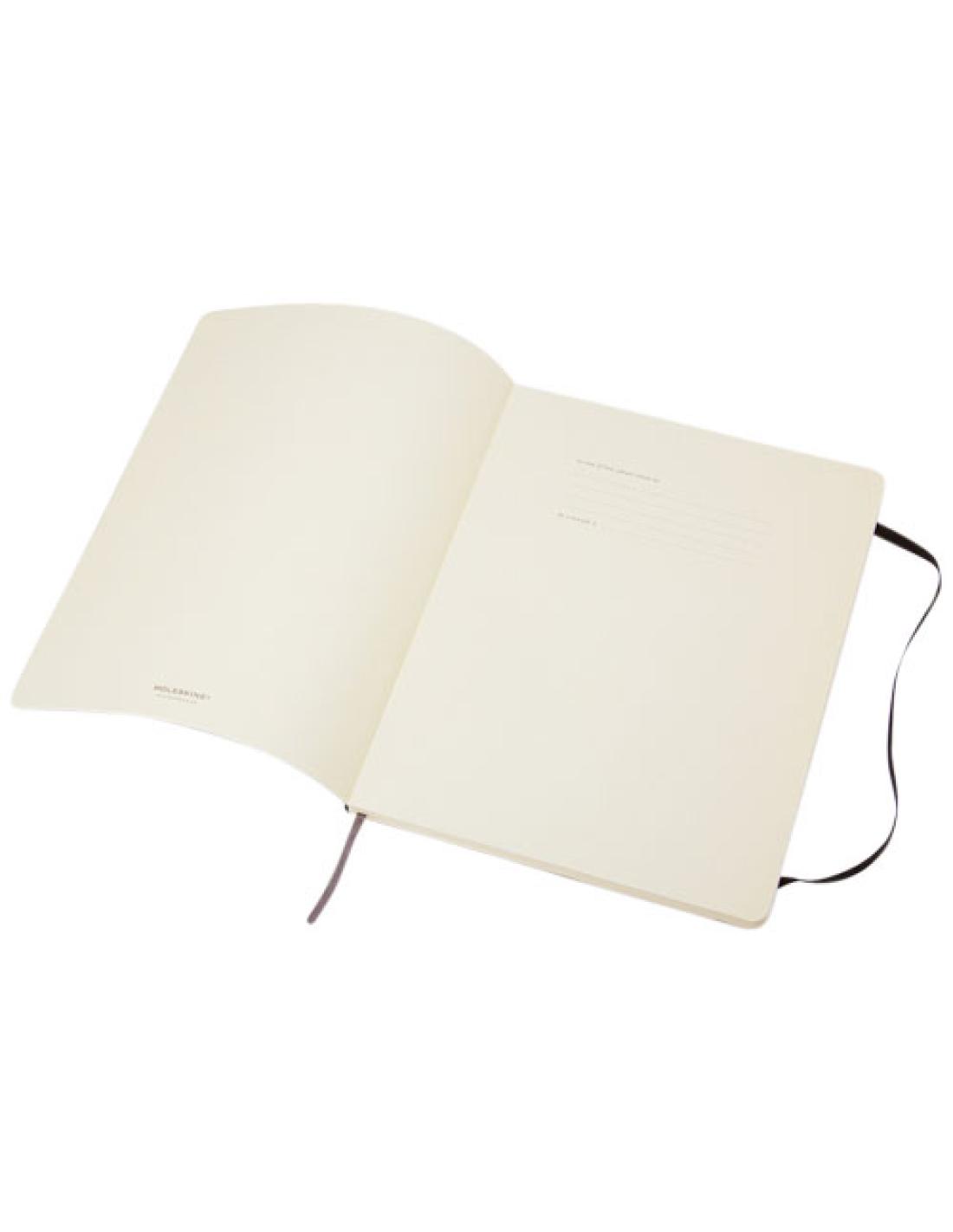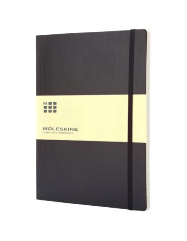 La libreta de tapa blanda "Moleskine Classic" XL (19 x 25 cm) está disponible en una amplia gama de elegantes colores intensos. La libreta cuenta con una tapa blanda de cartón con esquinas redondeadas, papel libre de ácido, un marcador y un cierre elástico. En la primera página hay una advertencia de «En caso de pérdida», con espacio para anotar una recompensa para quien lo encuentre. Unido a la cubierta posterior, hay un bolsillo interno extensible que incluye la historia de "Moleskine". El bolsillo se puede utilizar para papeles sueltos y notas. Contiene 192 páginas rayadas de color marfil.