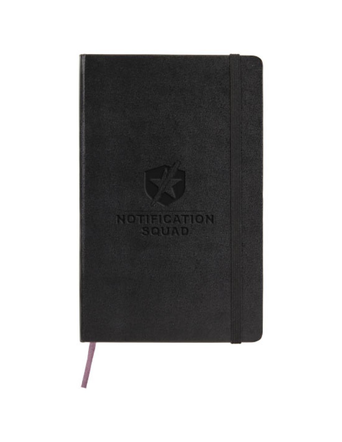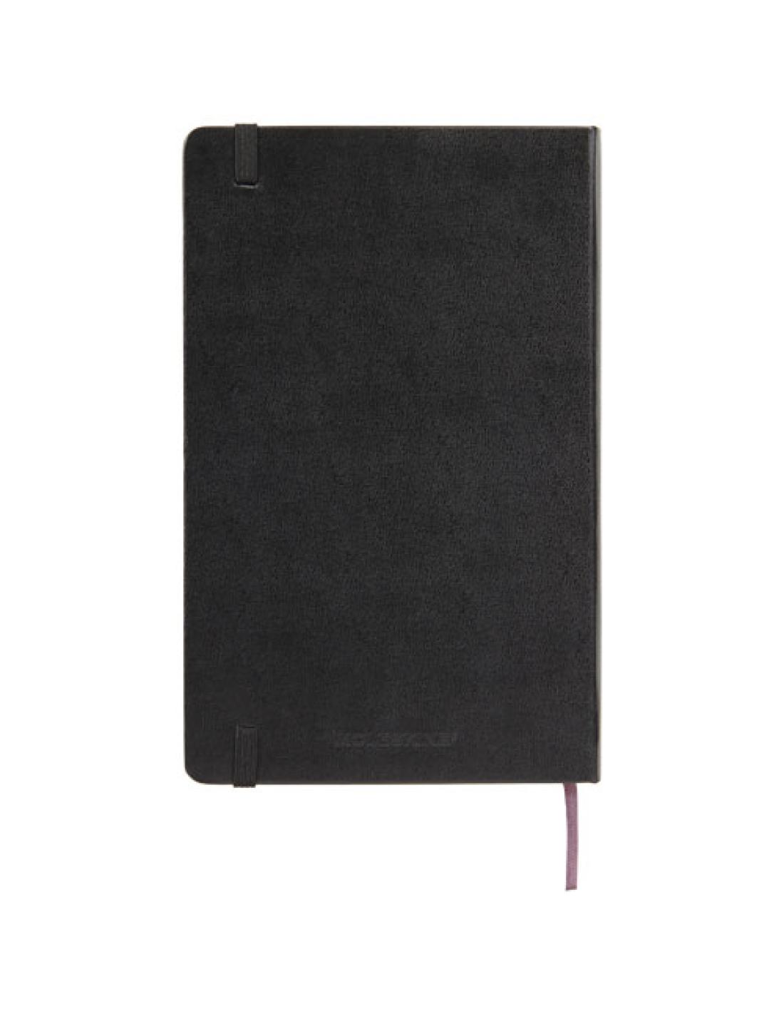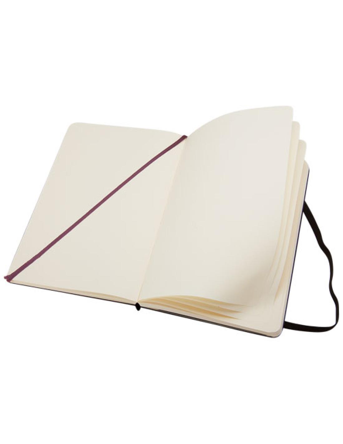 La libreta de tapa dura "Moleskine Classic" grande (13 x 21 cm) cuenta con una tapa encuadernada de cartón con esquinas redondeadas, papel libre de ácido, un marcador de cinta y un cierre elástico. En la primera página hay una advertencia de «En caso de pérdida», con espacio para anotar una recompensa para quien lo encuentre. Unido a la cubierta posterior, hay un bolsillo interior extensible que incluye la historia de "Moleskine". El bolsillo se puede utilizar para papeles sueltos y notas. Contiene 240 páginas rayadas de color marfil. Disponible en una amplia gama de elegantes colores .