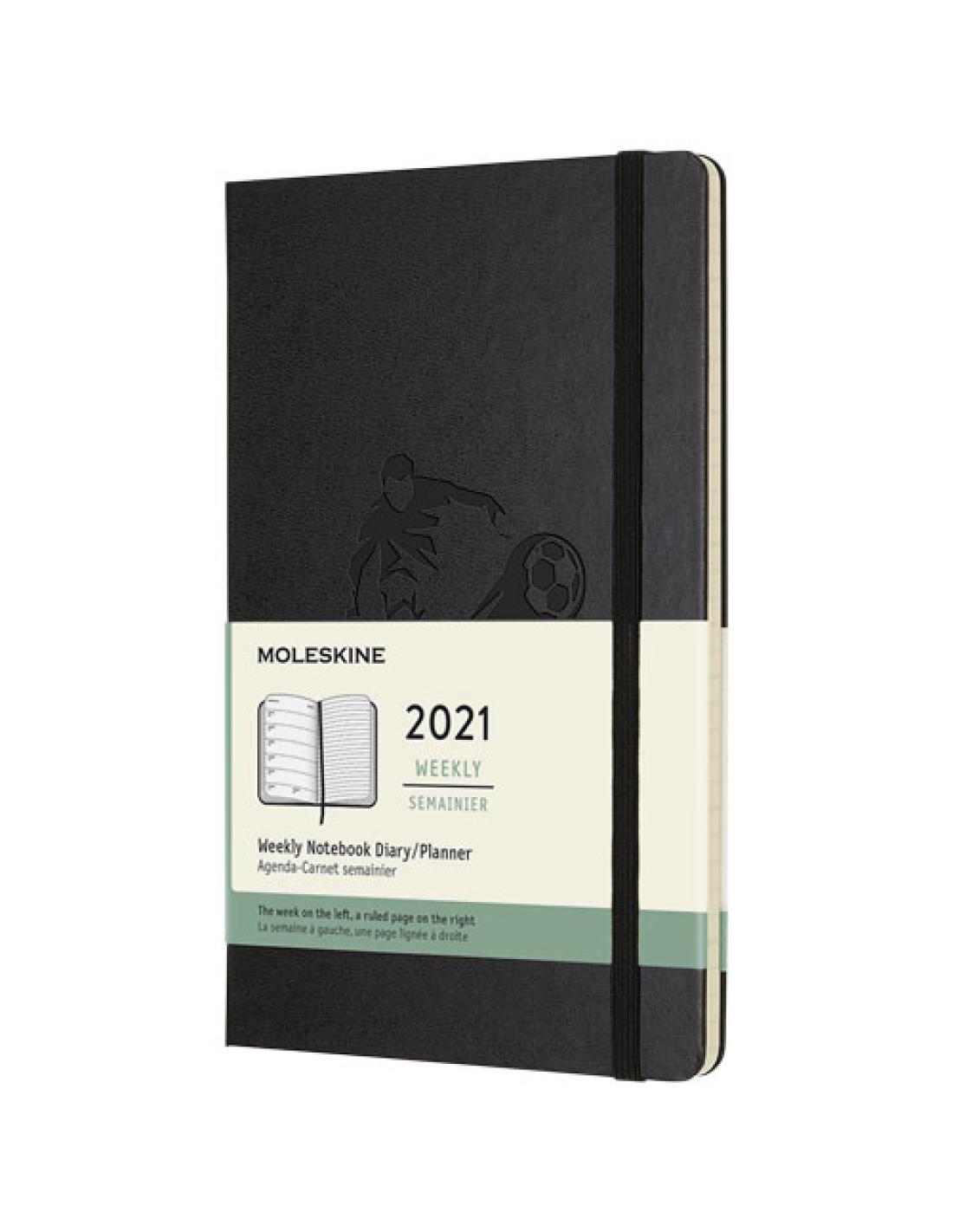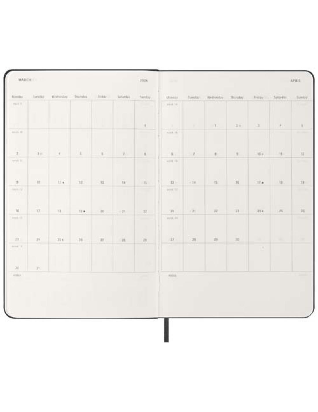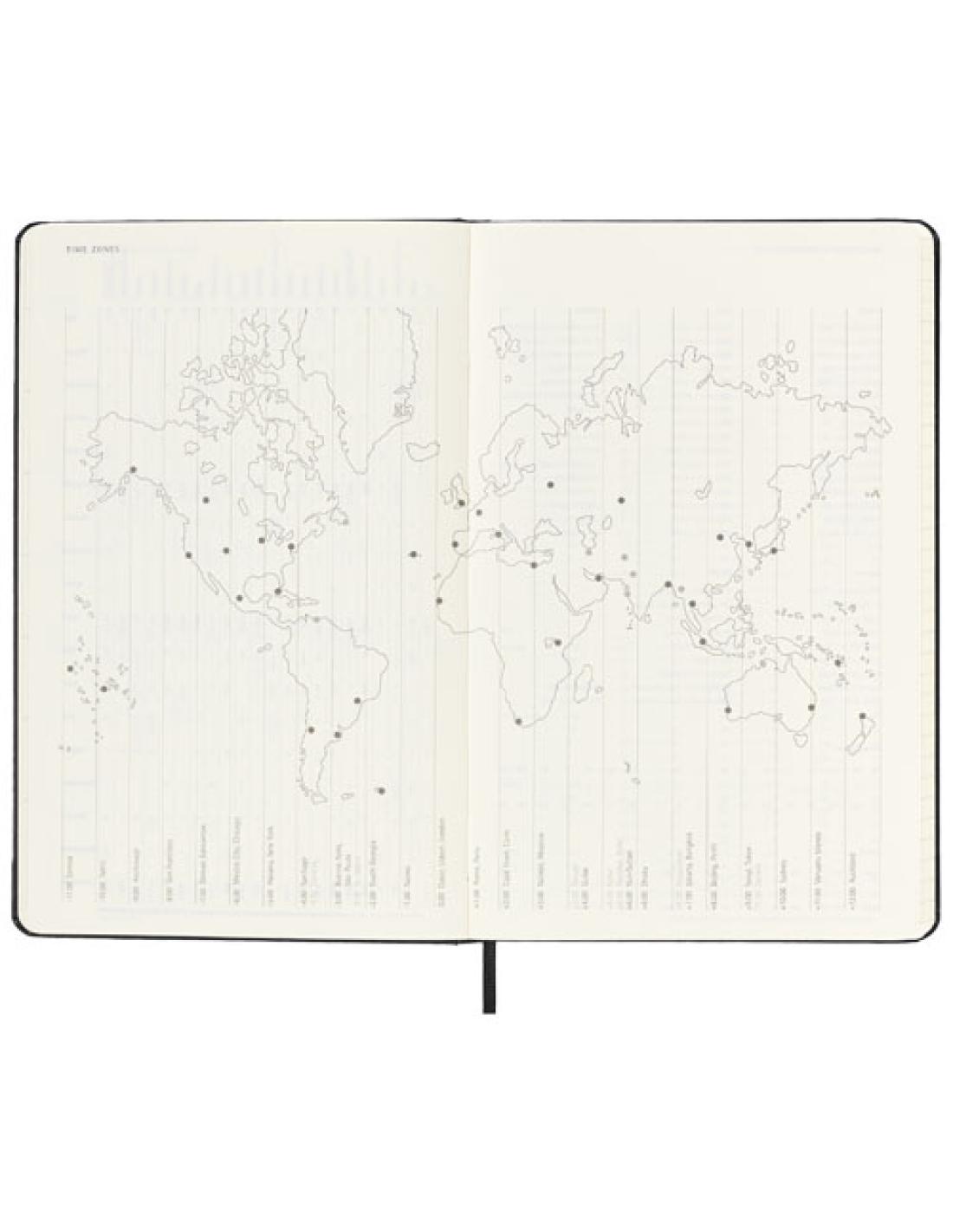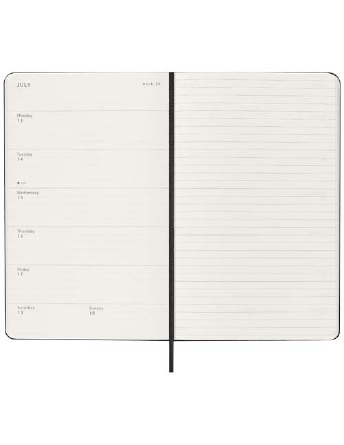 Fechada de enero a diciembre de 2026, la agenda semanal para 12 meses de tapa dura "Moleskine" muestra toda la semana de un vistazo, al tiempo que ofrece páginas con vista anual y mensual para una visión más amplia del año, seguidas de páginas para planificar viajes, ideas y objetivos. Los días de cada semana se muestran en una cara, mientras que la opuesta es una página rayada para tareas y notas. Incluye papel color marfil libre de ácidos, un cierre elástico negro, un marcapáginas de cinta, un bolsillo interior extensible de color a conjunto y adhesivos para la personalización, así como adhesivos del año para el lomo.