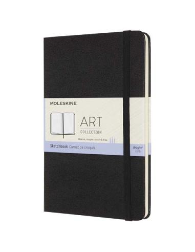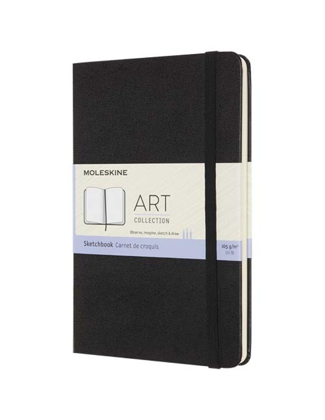 El cuaderno de dibujo mediano "Moleskine" está encuadernado en cartón, tiene las tapas redondeadas y papel de primera calidad libre de ácidos. El cuaderno de dibujo cuenta con un marcapáginas, un cierre elástico y un bolsillo interior extensible que contiene la historia de "Moleskine".