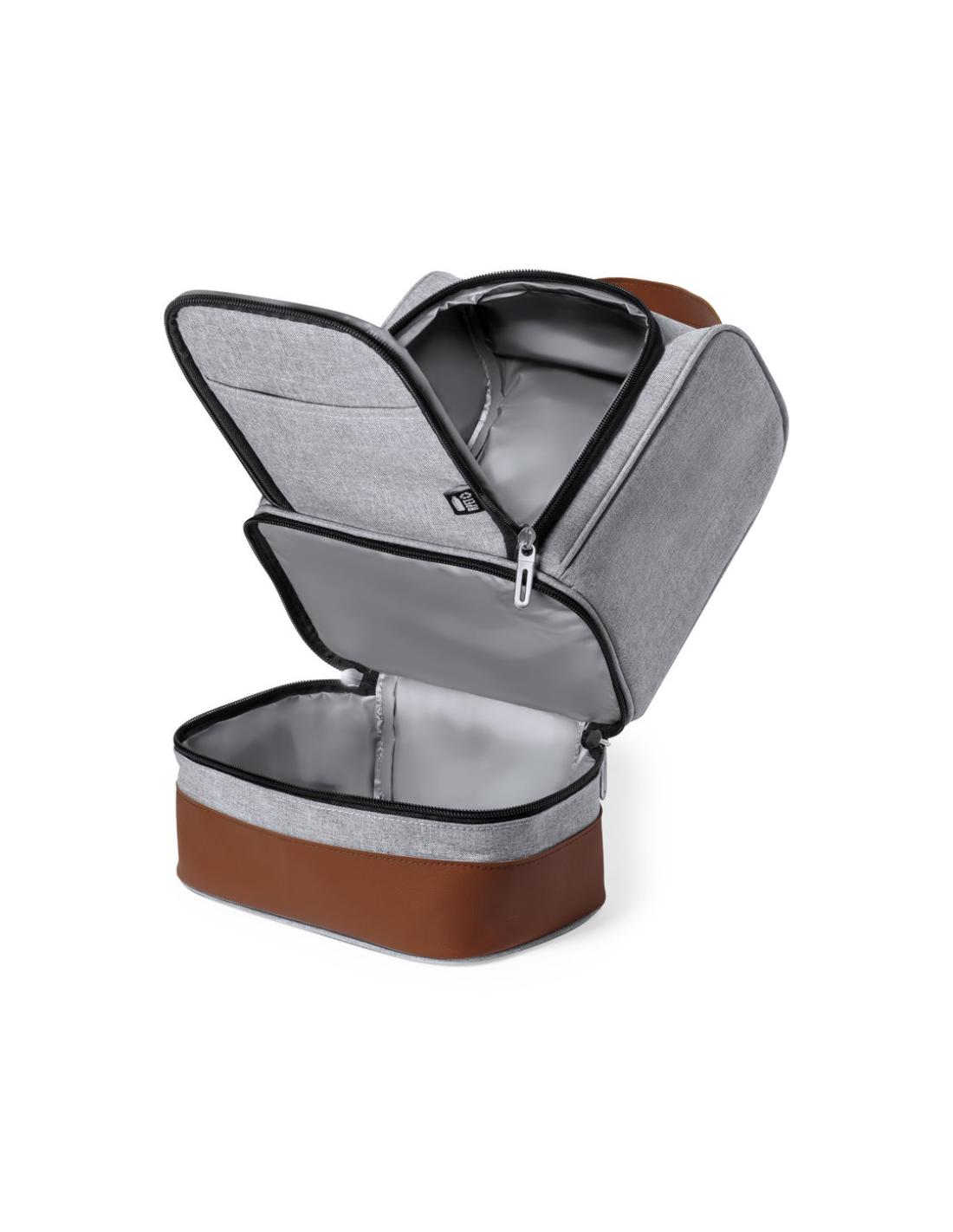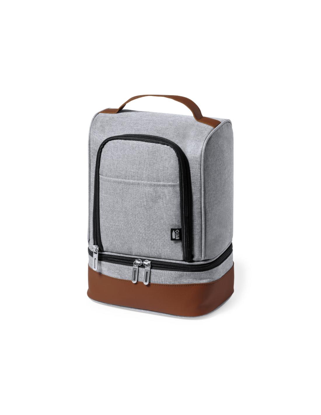 Nevera fabricada en resistente 600D RPET. Acabado en color gris, con base y asa de transporte en polipiel marrón. Incluye 2 compartimentos independientes, con cierre de cremallera y tiradores metálicos. Interior isotermo en PEVA y etiqueta exterior con distintivo RPET.El material RPET se elabora a partir de plástico reciclado, para así fomentar la reutilización de residuos plásticos y ayudar a la sostenibilidad del planeta.