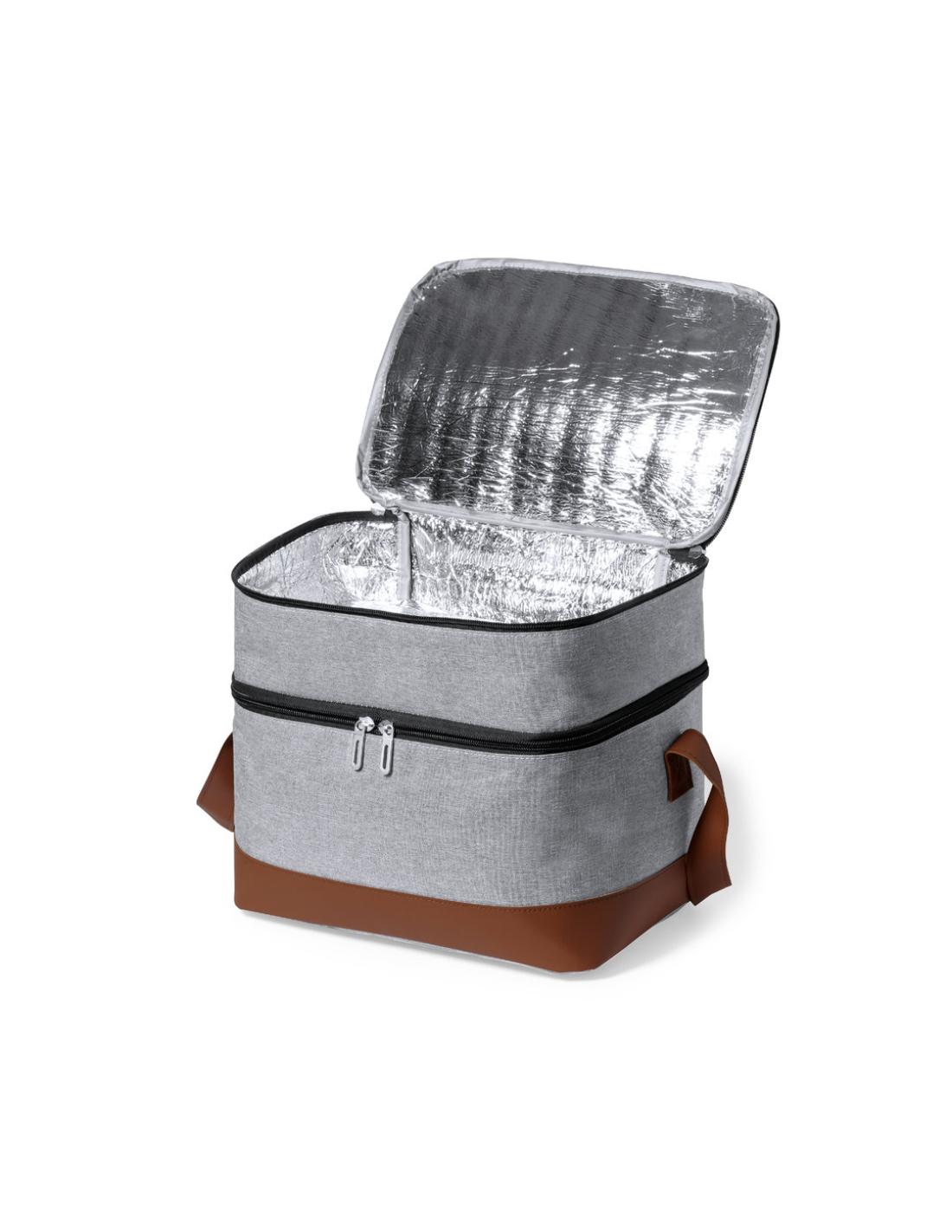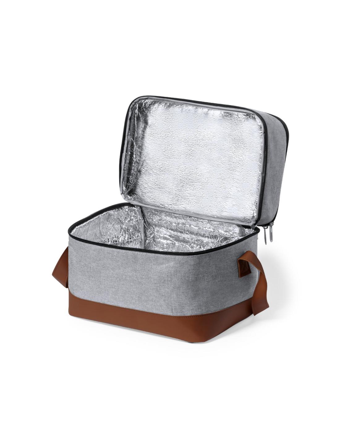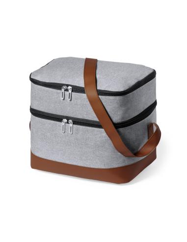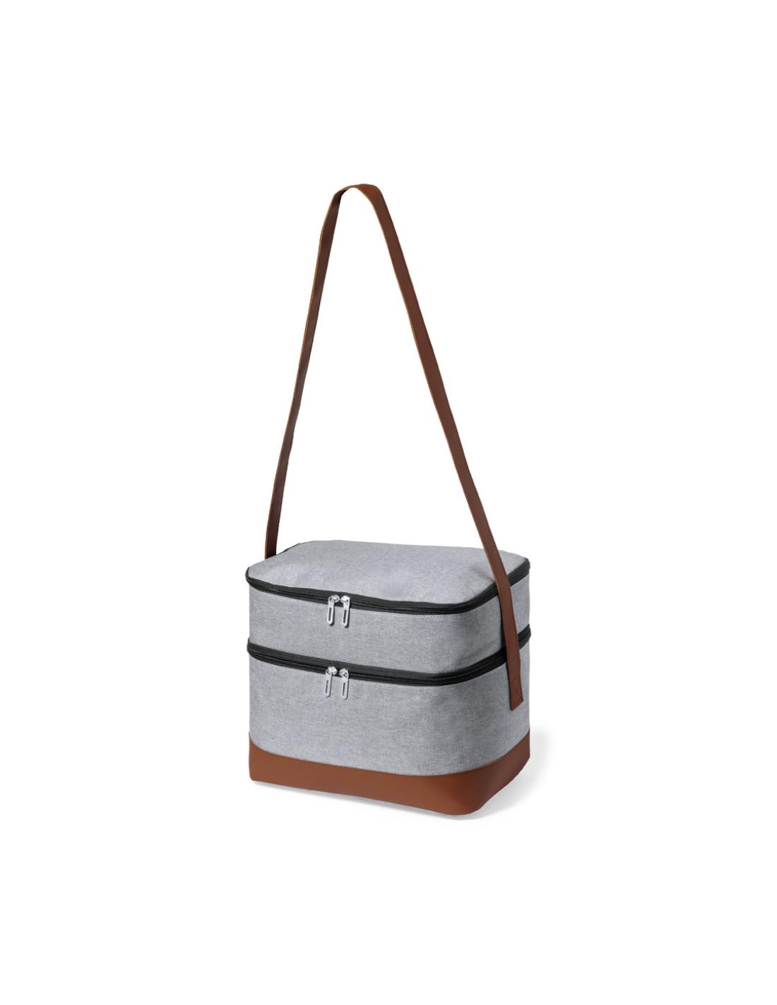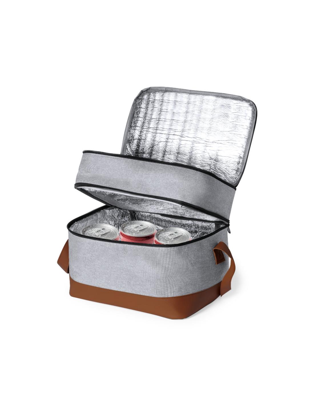 Nevera fabricada en resistente 600D RPET. Acabado en color gris, con base y cinta bandolera de transporte en polipiel marrón. Incluye 2 compartimentos independientes, con cierre de cremallera y tiradores metálicos. Interior isotermo en aluminio y etiqueta exterior con distintivo RPET.El material RPET se elabora a partir de plástico reciclado, para así fomentar la reutilización de residuos plásticos y ayudar a la sostenibilidad del planeta.