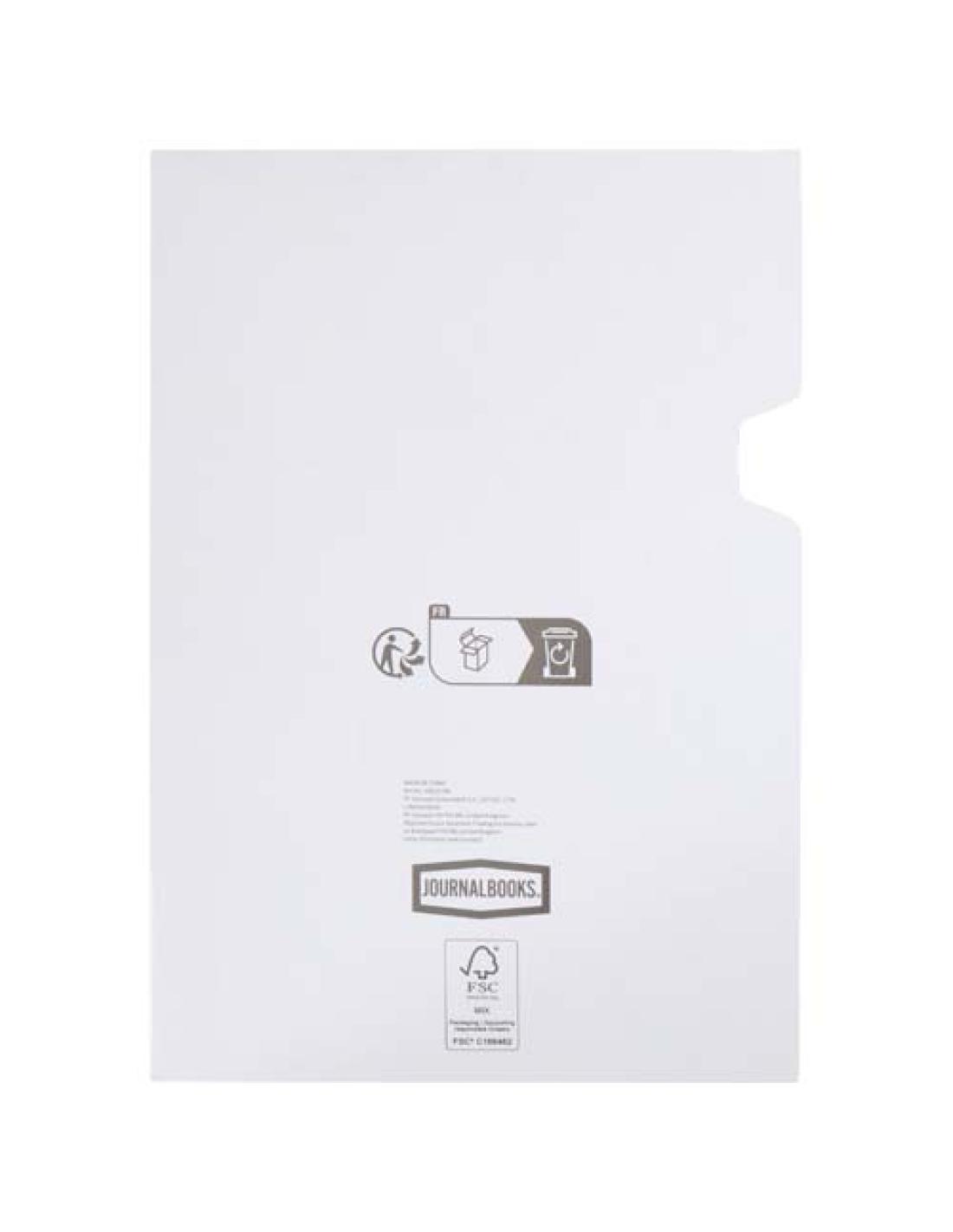 La libreta A5 "Alder" está fabricada con plástico reciclado símil piel e incluye 192 hojas de papel color crema de 80 g/m² con un diseño de agenda diaria, perfecta para llevar un diario y mantener la planificación durante todo el año. Incluye dos gomas elásticas, tres marcapáginas de cinta (negra, roja y azul), 200 pequeñas notas adhesivas de colores (40 de cada color) y un práctico bolsillo de papel para notas sueltas. Tiene un acabado con el logotipo gofrado JournalBooks en la contraportada y se presenta en una funda de papel blanco.