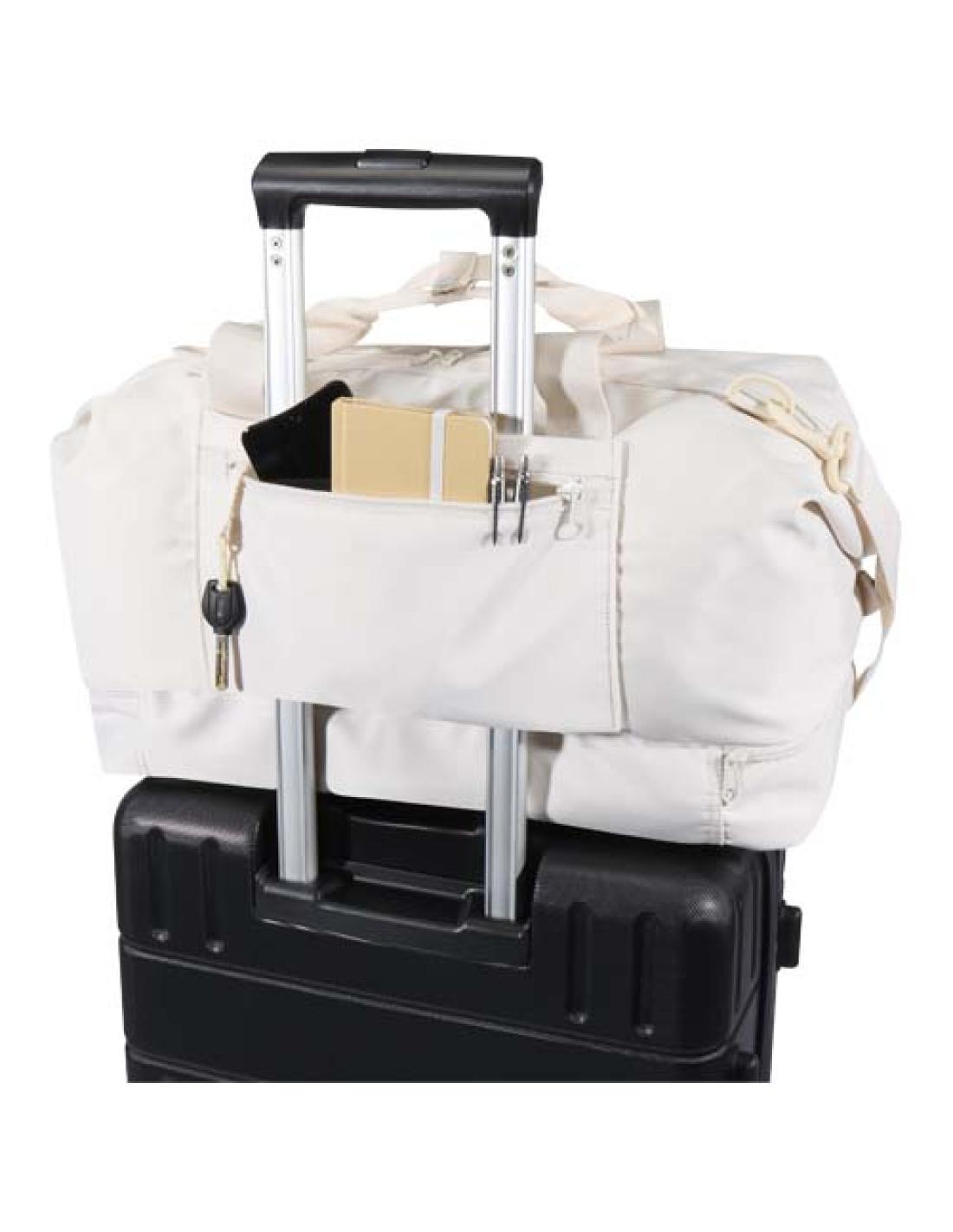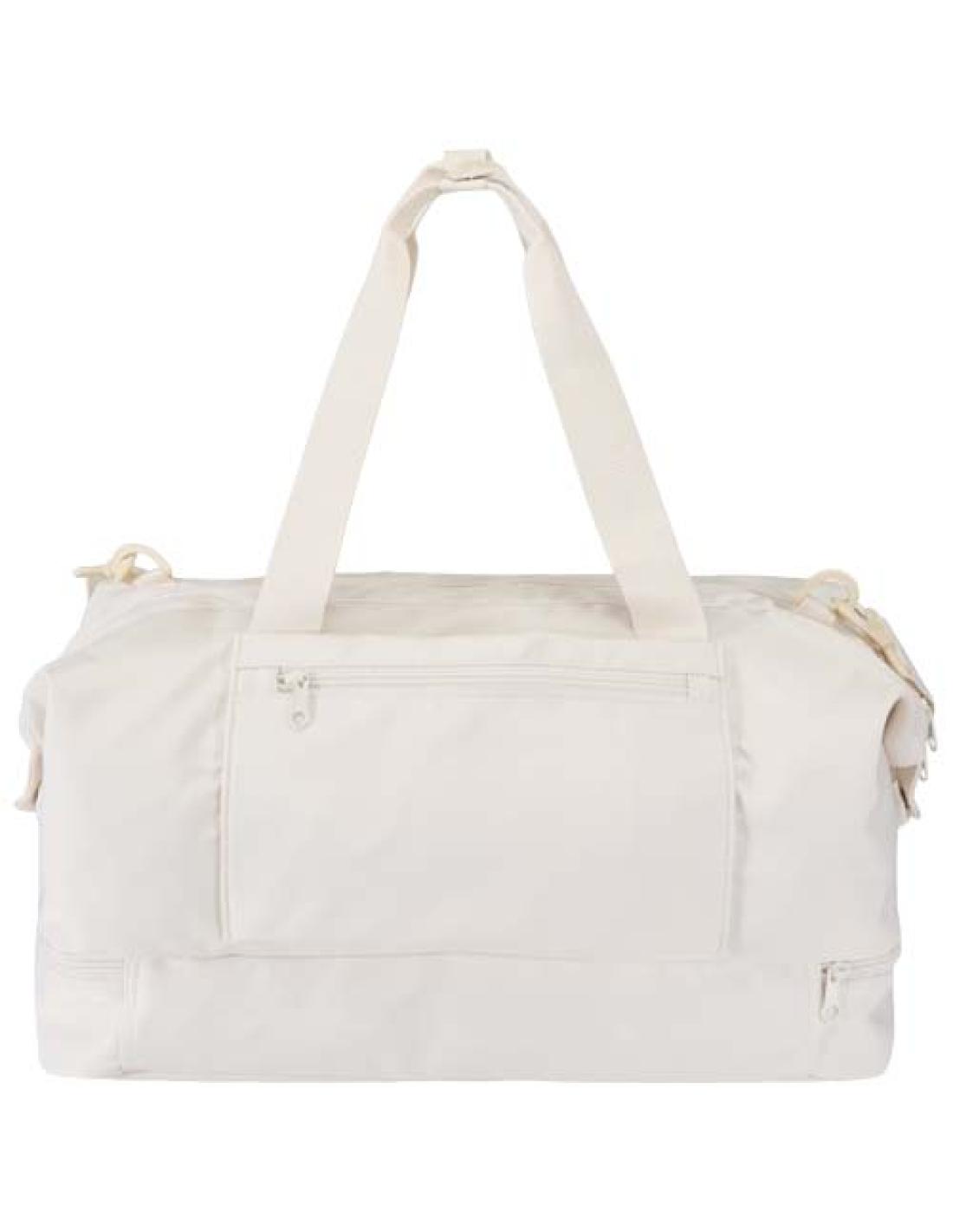 La bolsa de lona "Trip Aware™" reciclada de viaje es versátil y espaciosa, ideal para escapadas cortas y para llevar todos tus imprescindibles con facilidad. Fabricada en resistente poliéster de sarga 290D con un suave forro de punto y forrada con RPET 210D/poliuretano, está diseñada para un uso práctico y cómodo. El compartimento principal incluye un gran bolsillo con cremallera con espacio para el pasaporte, bolígrafos y una cinta para las llaves, además de dos bolsillos interiores y dos portabotellas. Un compartimento inferior independiente se abre en forma de almeja, perfecto para guardar el calzado o separar el equipo. Todas las bolsas tienen su propio rastreador "Aware™". Esta innovadora función permite a los usuarios rastrear el origen y el recorrido de su artículo a través de un código QR, lo...
