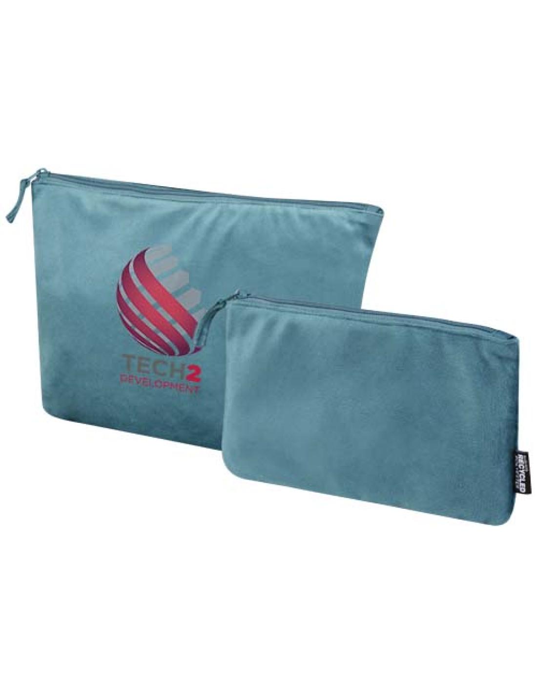 Juego de dos neceseres de poliéster aterciopelado reciclado con certificado GRS. El juego incluye una bolsa grande y otra pequeña para un almacenamiento organizado. Ligero, duradero y fácil de guardar. La bolsa grande mide 32 x 21 cm y la pequeña, 23 x 13 cm.
