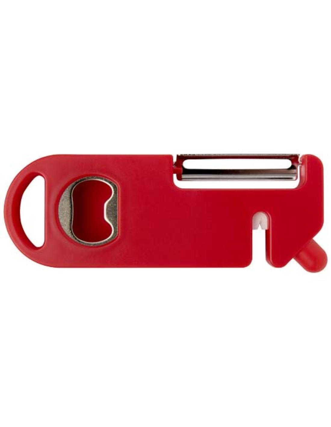 Este utensilio de cocina multiusos combina cuatro funciones esenciales en un diseño compacto. Fabricado con plástico reciclado, cuenta con pelador, abridor de botellas, afilador de cuchillos y una punta puntiaguda para eliminar las marcas de las patatas. Cuenta con un orificio para colgar que permite guardarlo fácilmente. Práctico y compacto, es un utensilio versátil que no puede faltar en casa.