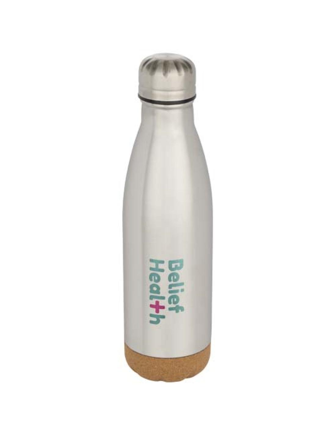 Botella de agua de acero inoxidable con aislamiento y detalles de corcho en la parte inferior. El aislamiento de doble pared mantiene las bebidas calientes o frías durante varias horas. Se presenta en una caja de regalo de cartón reciclado. Capacidad: 500 ml.