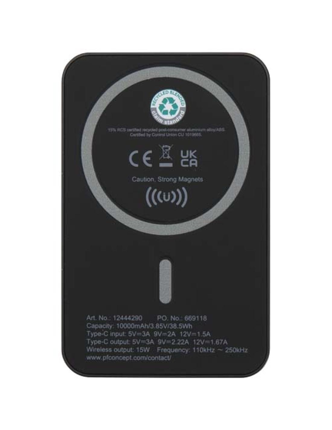 Batería externa inalámbrica magnética de 10 000 mAh y 15 W con PD de 20 W fabricada con plástico reciclado N10244421