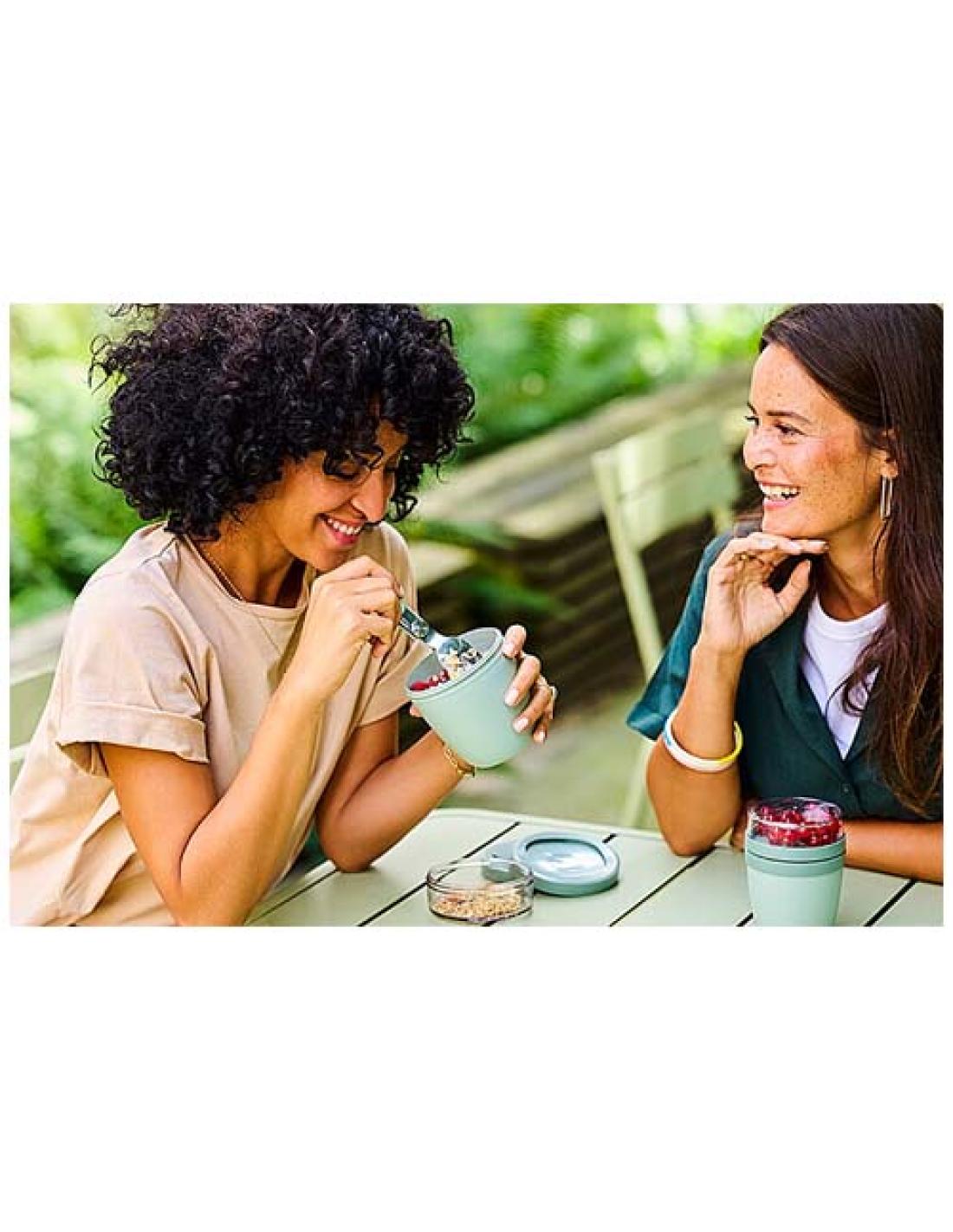La fiambrera "Ellipse Mini" es perfecta para una gran variedad de aperitivos, como yogur con muesli o sopa con picatostes. Dispone de dos ingeniosos compartimentos en un recipiente resistente, lo que permite mantener los ingredientes perfectamente separados. Su tamaño compacto la hace ideal para llevarla en la mochila del colegio y disfrutar de una comida rápida y práctica. El recipiente superior transparente tiene una capacidad de 120 ml, ideal para unos 50 gramos de muesli o fruta, y el inferior tiene una capacidad de 300 ml. Apto para lavavajillas y hermético. Sin BPA.