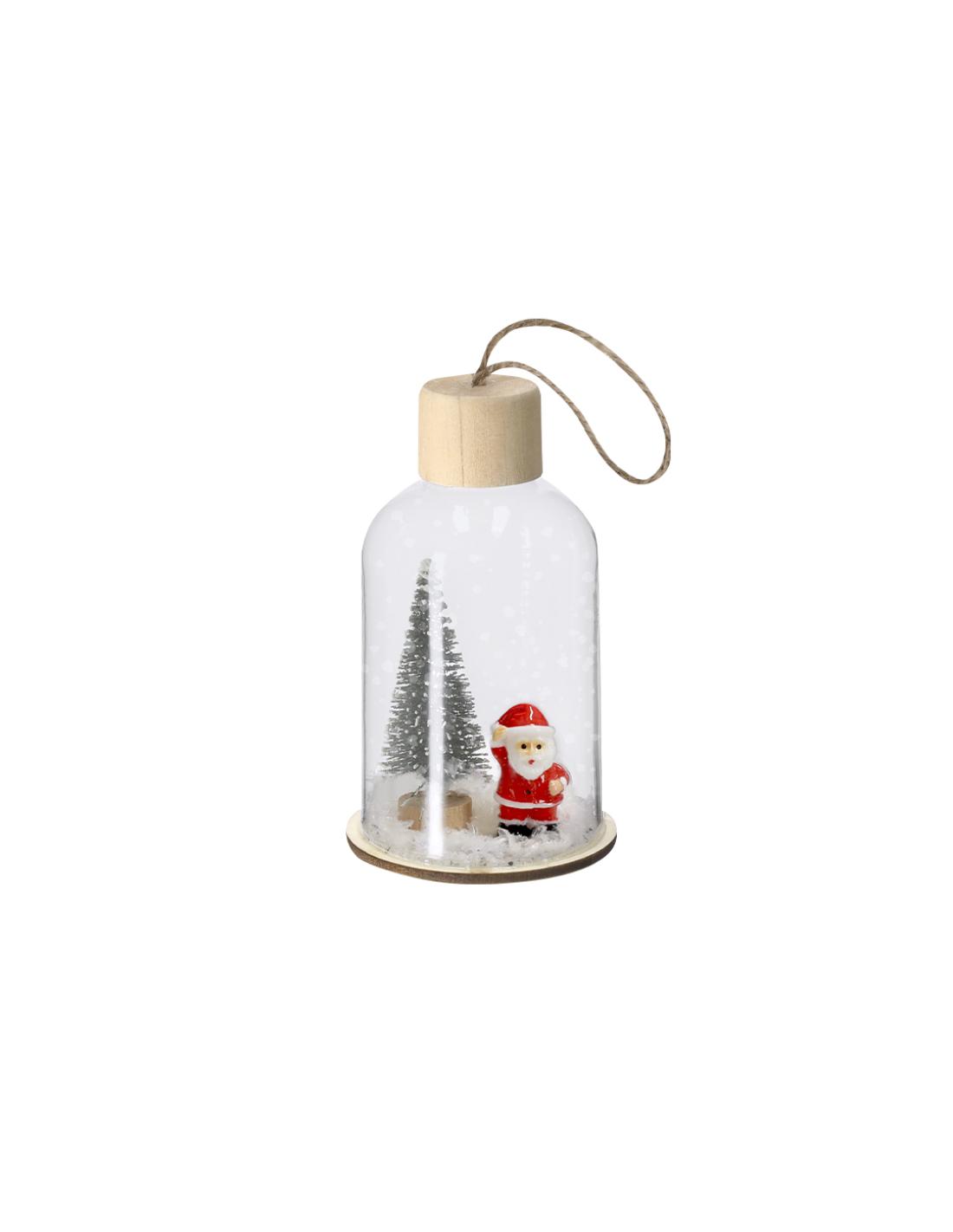 Adorno navideño fabricado en resistente vidrio, con base de madera natural. Incluye accesorio para colgar en yute natural. Dispone de iluminación interior con 1 LED en tono blanco. Alimentación por 3 pilas de botón, incluidas, con botón ON/OFF en la base.