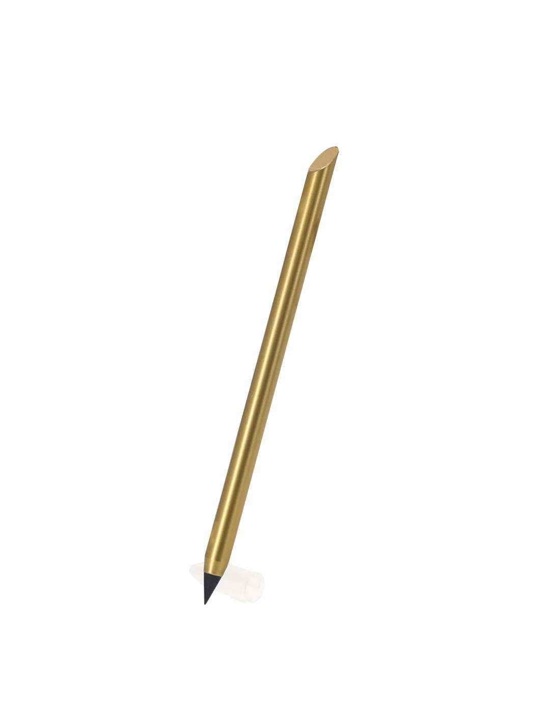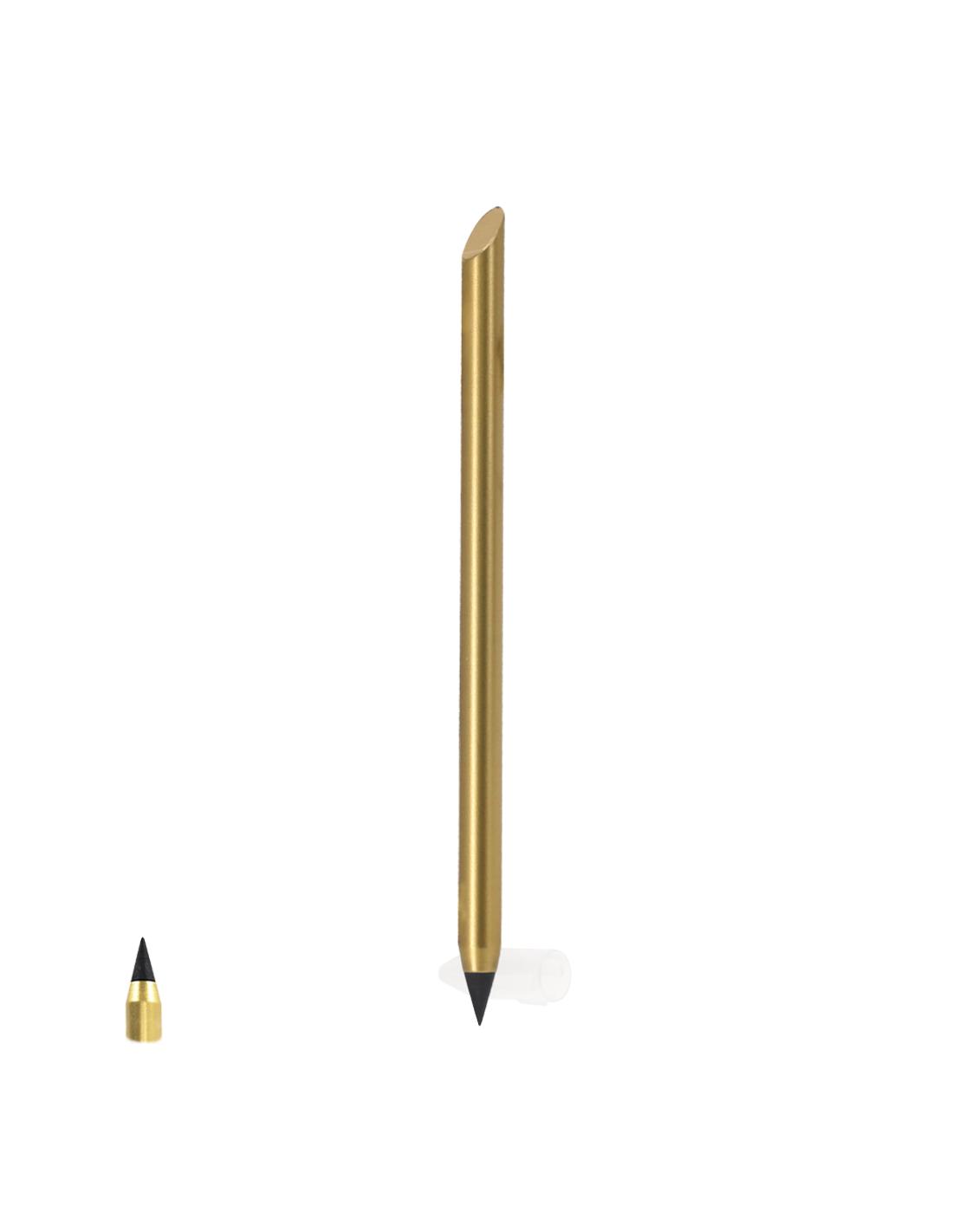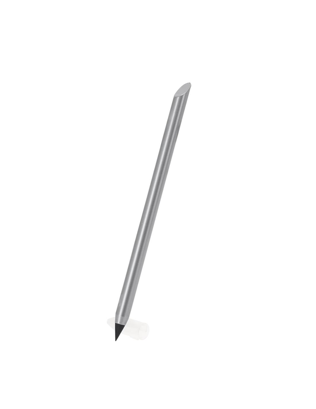 Lápiz eterno fabricado en aluminio reciclado. Reutilizable y con escritura infinita, para así usar siempre el mismo lápiz y no generar residuos. Incluye distintivo de aluminio reciclado en la parte superior y cubierta protectora para resguardar la punta de grafito.