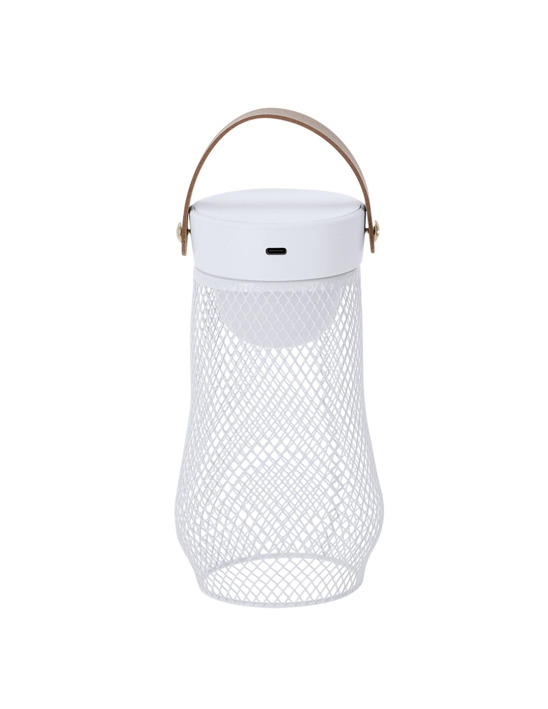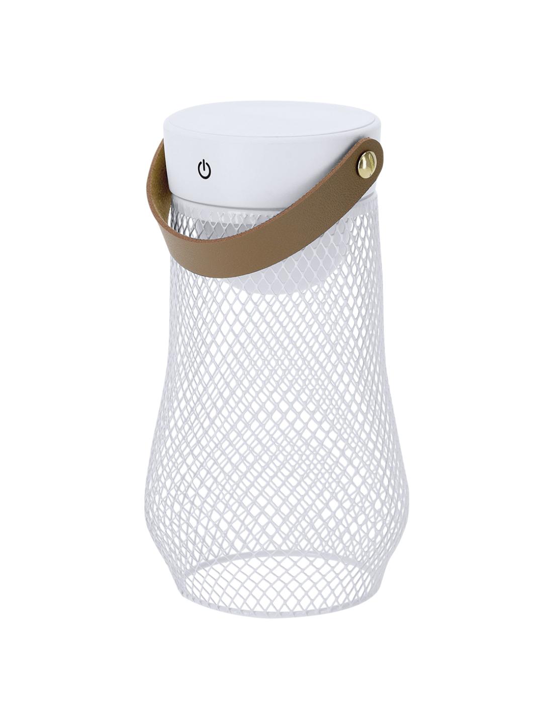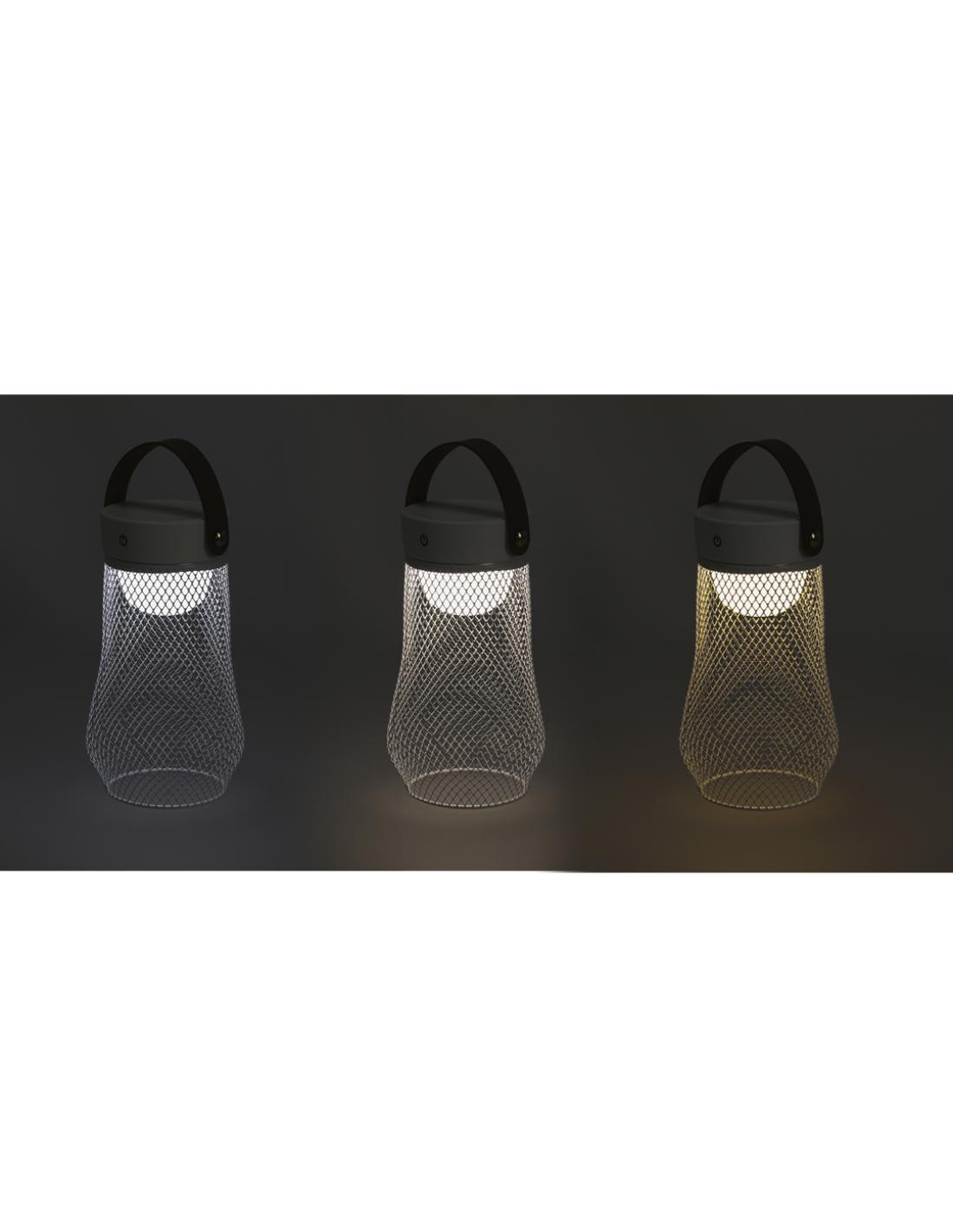 Lámpara de diseño en metal. Incluye asa superior en suave PU. Dispone de 3 modos de luz (blanca, neutra y cálida). Equipada con 24 LEDs. Ideal tanto para espacios interiores como exteriores. Botón táctil integrado para encendido, apagado y la selección del modo de luz. Equipada con batería recargable de 1.200 mAh y entrada Tipo C.