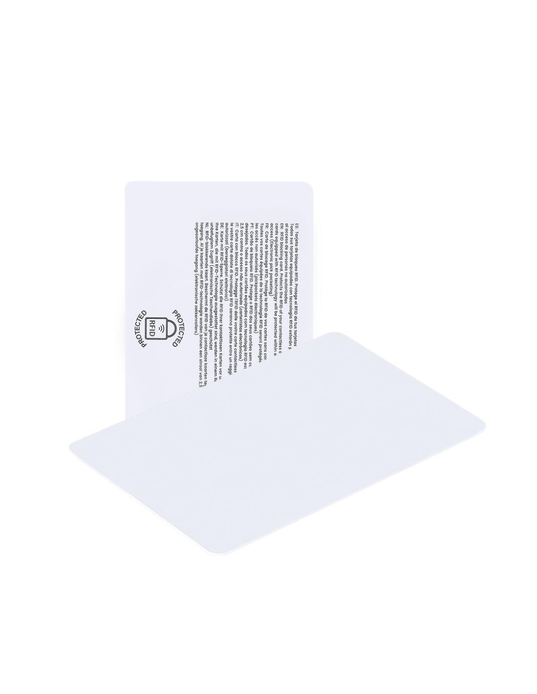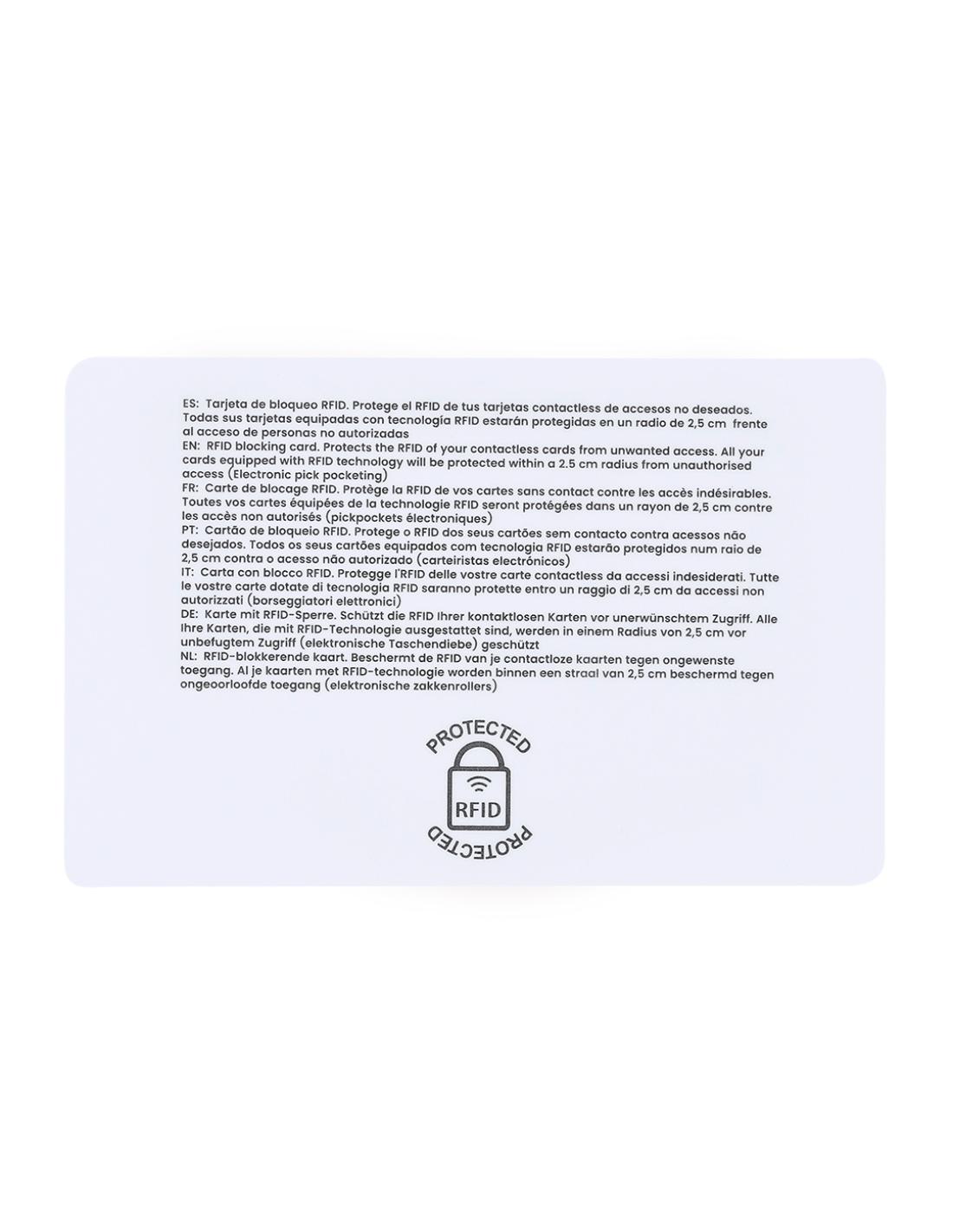 Tarjeta con sistema de protección RFID, diseñada para bloquear accesos no autorizados a tarjetas contactless. Funciona mediante un campo electromagnético que interfiere con las señales de lectura, protegiendo las tarjetas ( bancarias, de crédito, transporte público, etc.) ubicadas en un radio de entre 2 y 3 cm alrededor de la tarjeta.