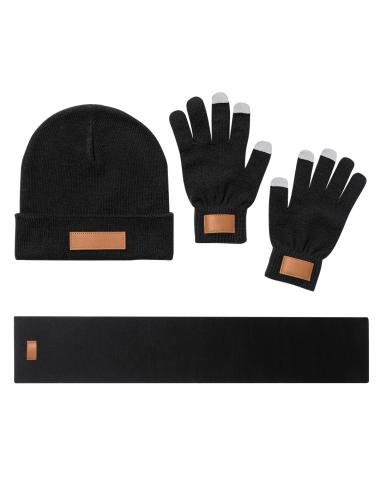 Set de 3 piezas: gorro, bufanda y guantes táctiles, ideales para ofrecer confort y funcionalidad en días fríos. Cada pieza incorpora una etiqueta cosida en PU marrón, ideal para marcaje. Presentado en elegante caja negra.
