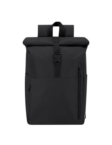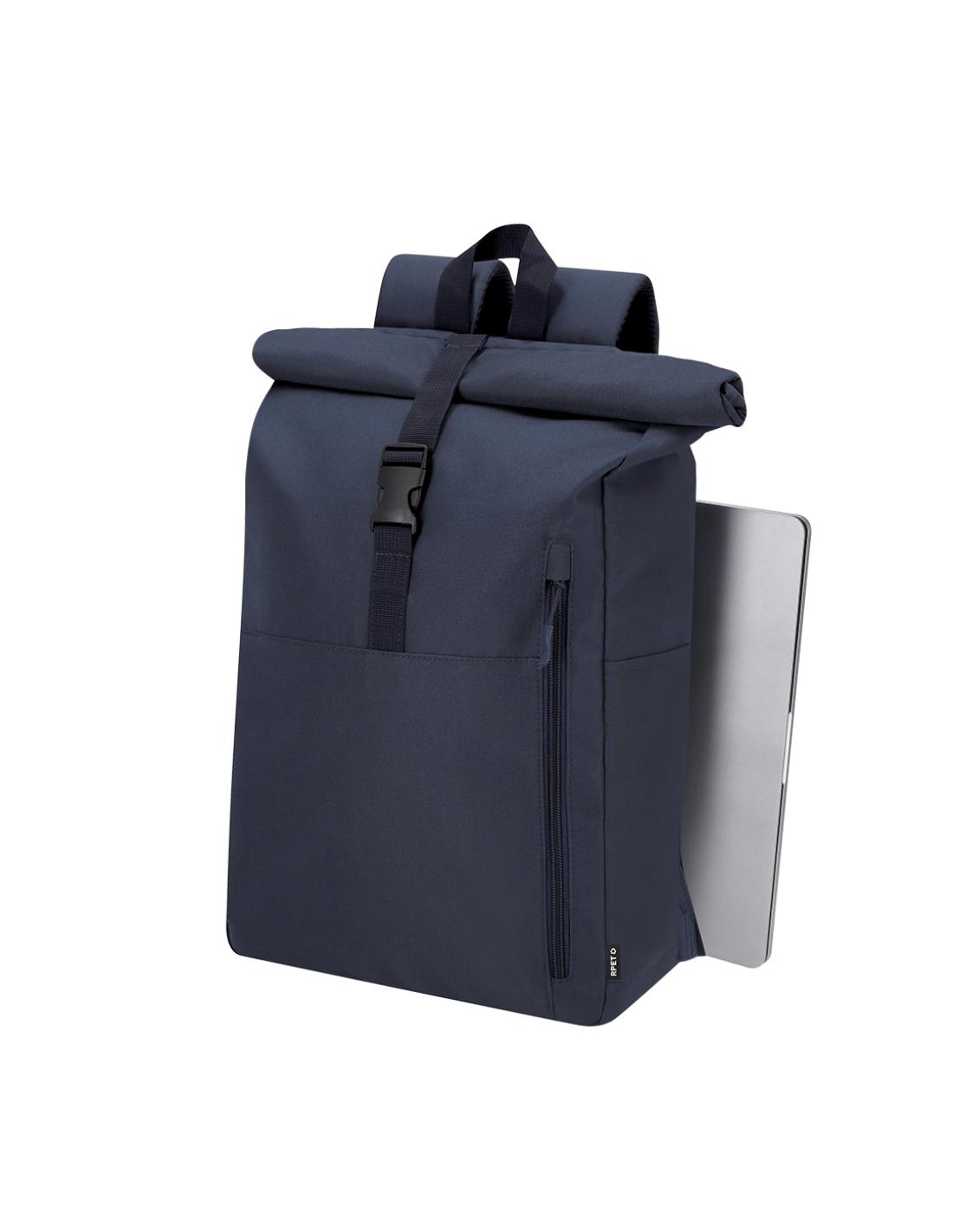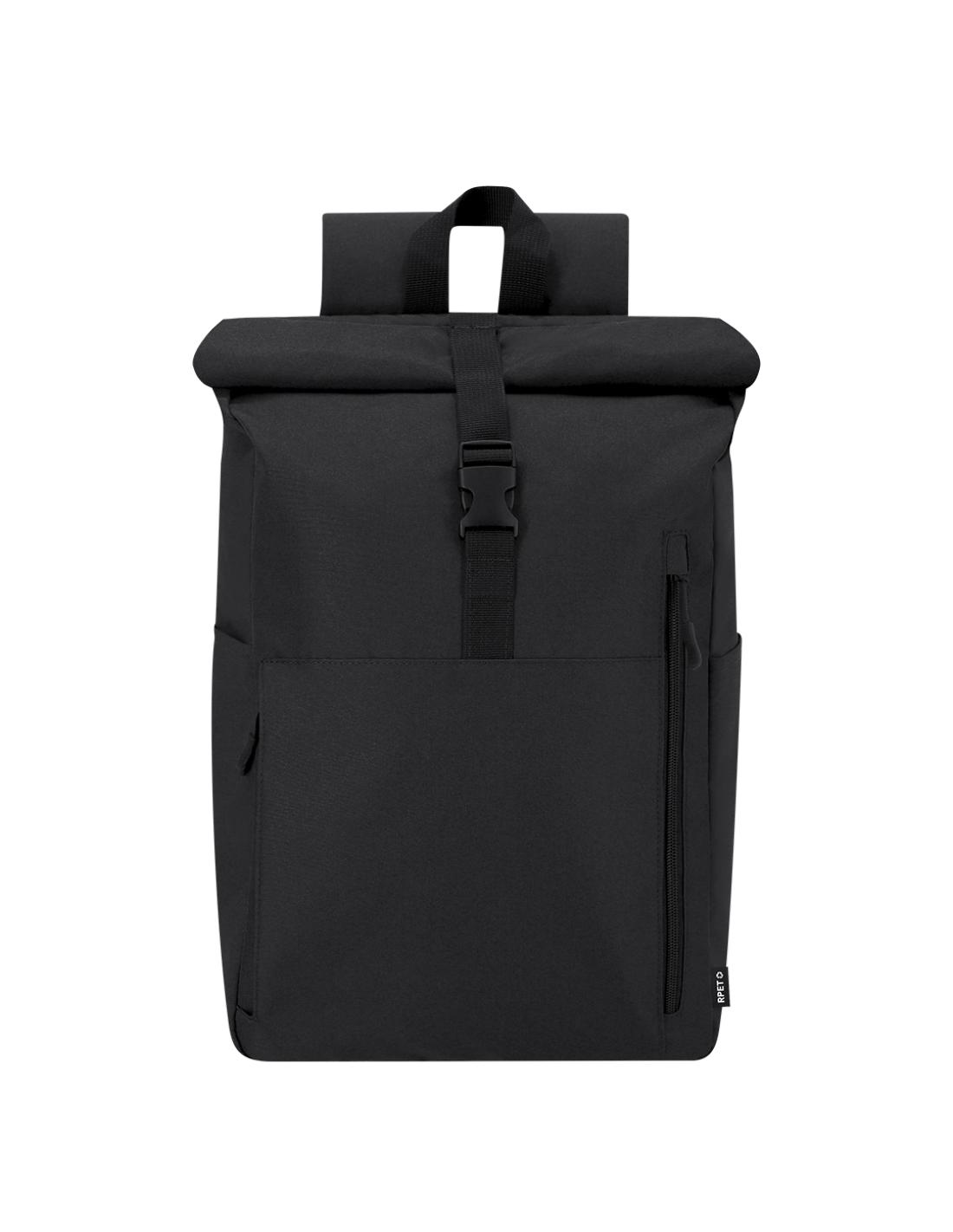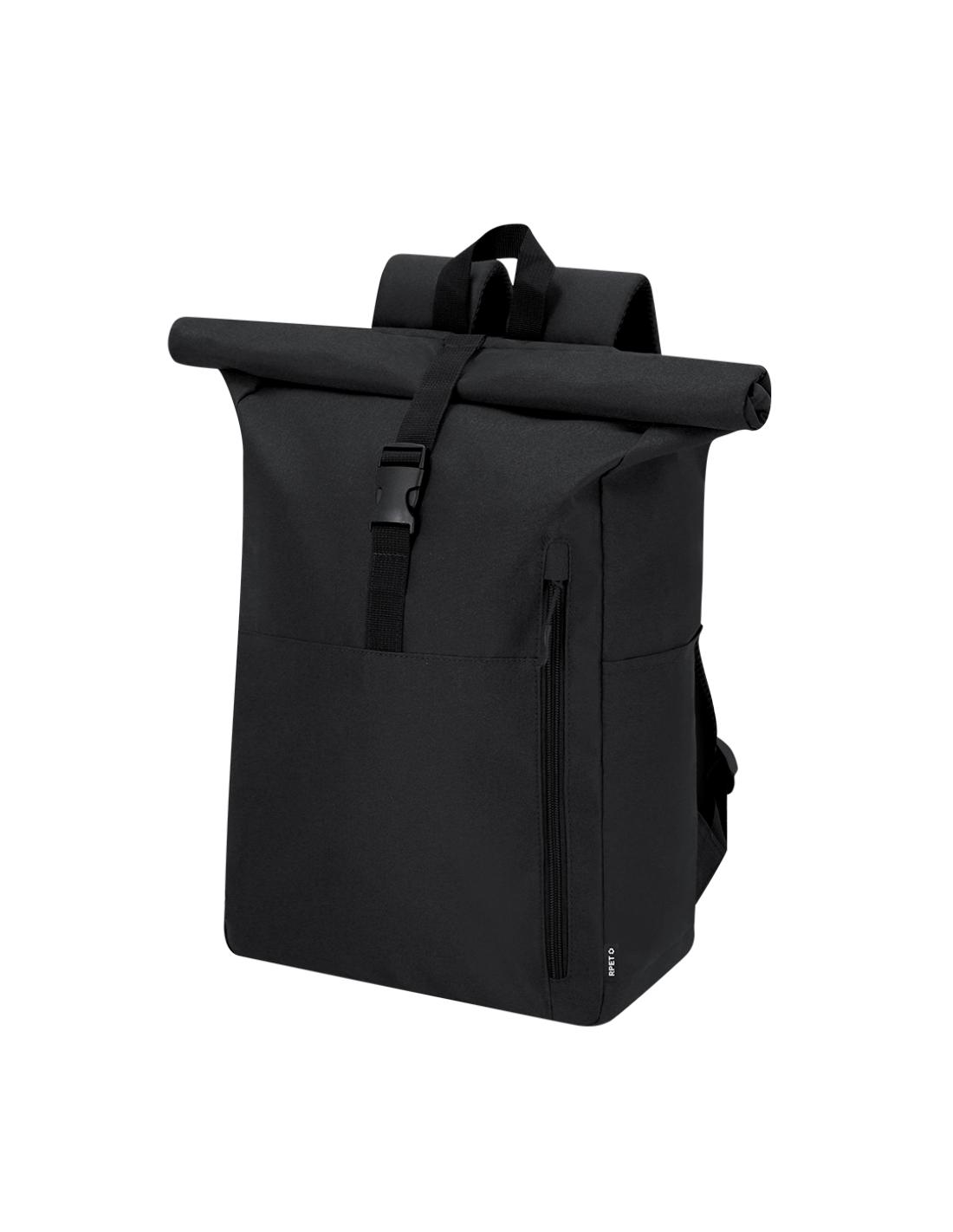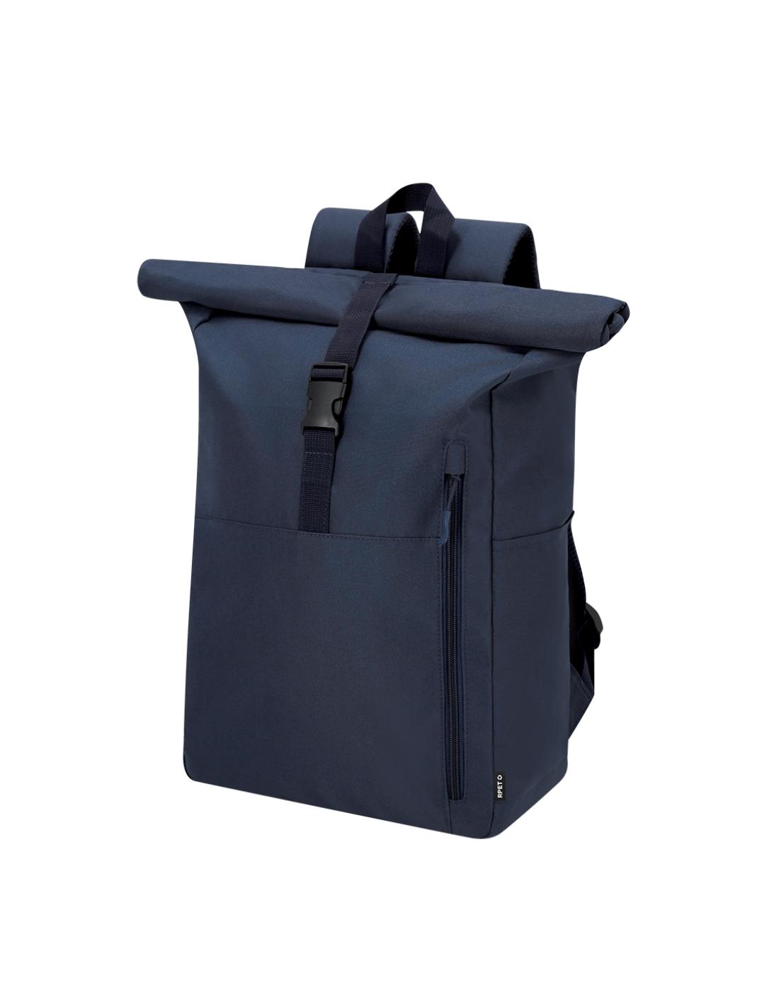 Mochila confeccionada en resistente RPET 300D. Con sistema de cierre enrollable y hebilla. Dispone de dos bolsillos frontales, un bolsillo trasero con acceso lateral y dos bolsillos laterales adicionales. Interior de gran capacidad con compartimento interior acolchado para portátil de hasta 15 pulgadas. Cintas de hombros y espalda acolchachadas. Incluye cinta de transporte para ajuste en trolley o maleta, ideal para viajes y desplazamientos. El material RPET se elabora a partir de plástico reciclado, para así fomentar la reutilización de residuos plásticos y ayudar a la sostenibilidad del planeta.