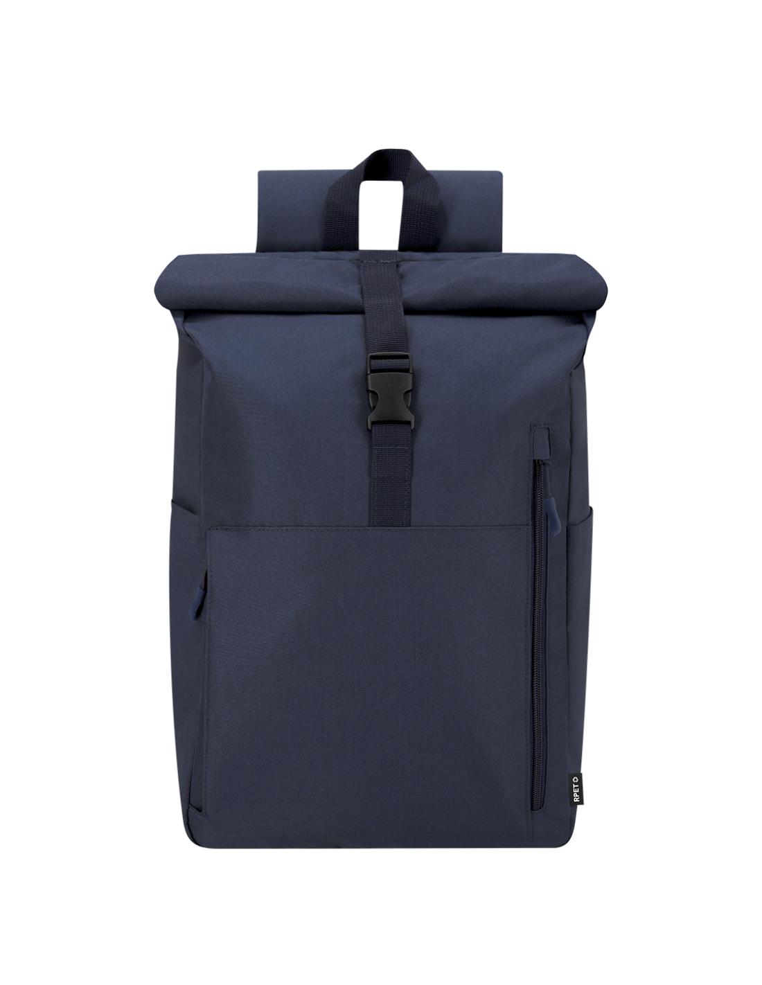 Mochila confeccionada en resistente RPET 300D. Con sistema de cierre enrollable y hebilla. Dispone de dos bolsillos frontales, un bolsillo trasero con acceso lateral y dos bolsillos laterales adicionales. Interior de gran capacidad con compartimento interior acolchado para portátil de hasta 15 pulgadas. Cintas de hombros y espalda acolchachadas. Incluye cinta de transporte para ajuste en trolley o maleta, ideal para viajes y desplazamientos. El material RPET se elabora a partir de plástico reciclado, para así fomentar la reutilización de residuos plásticos y ayudar a la sostenibilidad del planeta.