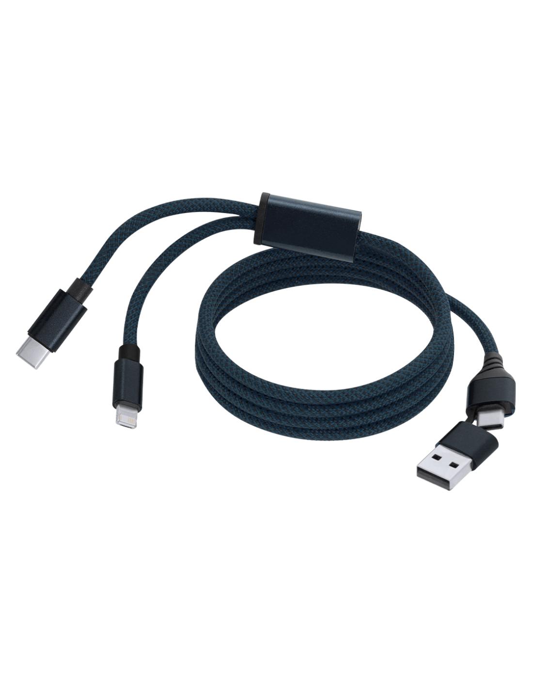 Cable cargador con diseño imantado para evitar enredos, en resistente aluminio. Con conexión de entrada dual Tipo C/USB y salidas Tipo C y 2 en 1 (Lightning y Micro USB).