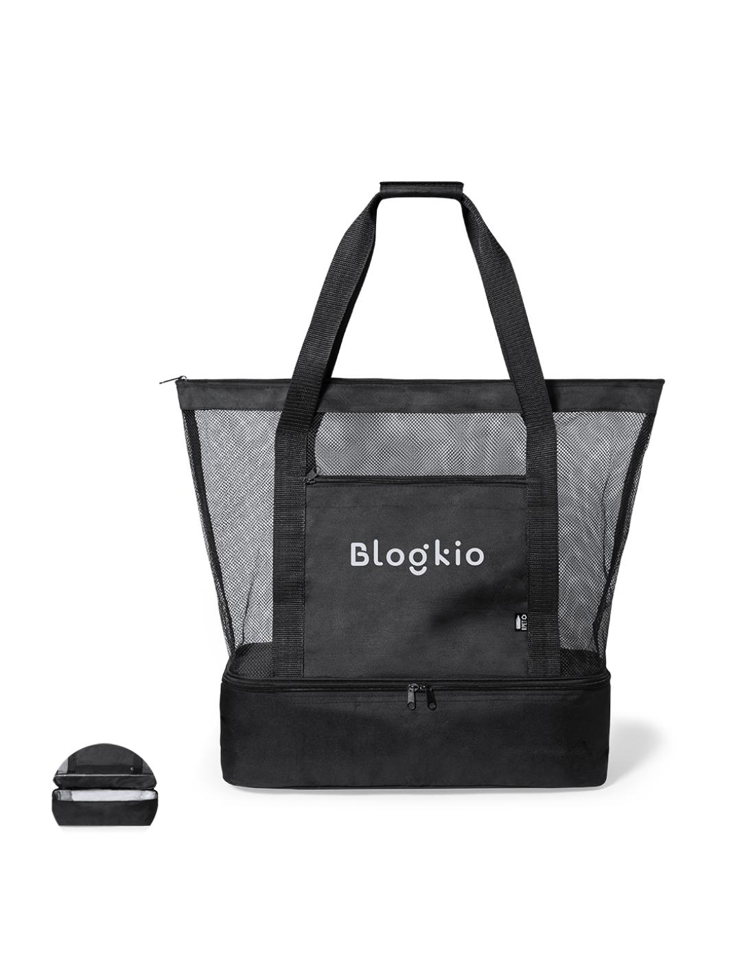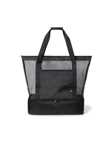Bolsa nevera en resistente poliéster RPET 600D elaborado a partir de plástico reciclado para así fomentar la reutilización de residuos plásticos y contribuir a la sostenibilidad del planeta. Compartimento principal en redecilla tipo mesh, con cierre de cremallera. Nevera integrada en base, en resistente poliéster 600D RPET, con interior isotermo en PEVA. Asas de transporte reforzadas y amplio bolsillo frontal, con distintivo RPET en etiqueta.