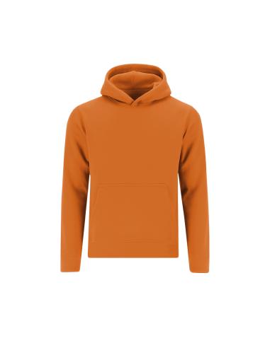 Sudadera infantil unisex con capucha forrada a tono de doble tejido. Confeccionada en algodón y poliester en suave felpa perchada de 280 g/m2. Con bolsillo tipo canguro. Cubrecosturas en el cuello. Puños y la cintura en punto canalé 1x1 con elastano para mayor ajuste y confort.