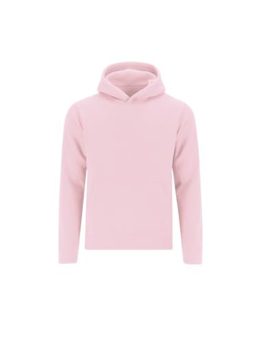 Sudadera infantil unisex con capucha forrada a tono de doble tejido. Confeccionada en algodón y poliester en suave felpa perchada de 280 g/m2. Con bolsillo tipo canguro. Cubrecosturas en el cuello. Puños y la cintura en punto canalé 1x1 con elastano para mayor ajuste y confort.