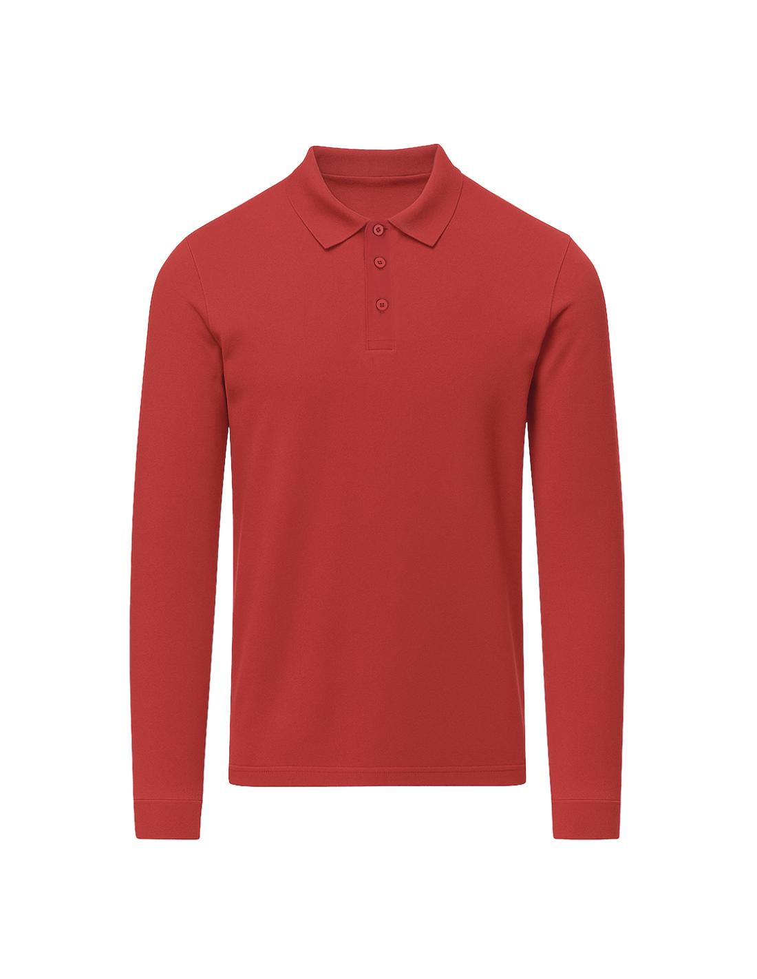 Polo unisex de manga larga confeccionado en tejido piqué. Cuello y puños en punto elástico 1x1 con elastano para un mejor ajuste y confort. Tapeta de tres botones a tono y cubrecosturas reforzado en cuello.