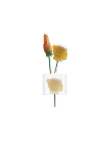 - Personalización: De 1 a 4 tintas en el envoltorio (sobre color de fondo del papel) y piruleta con molde 3D personalizado.