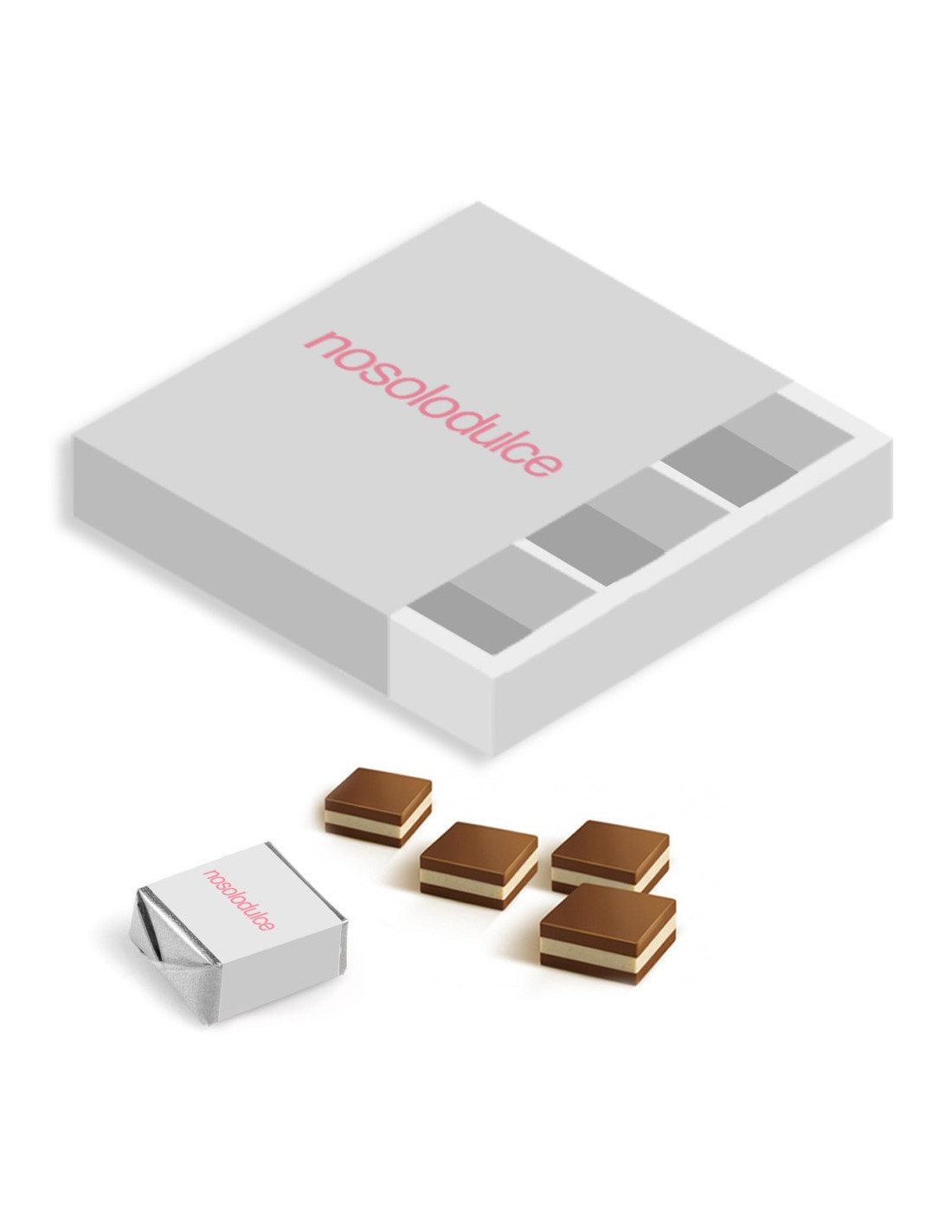 - Envasado: Caja de cartón con 9 bombones cortados. Cada bombón cortado se presenta con envuelta de aluminio (plata u oro a elegir) con anilla.