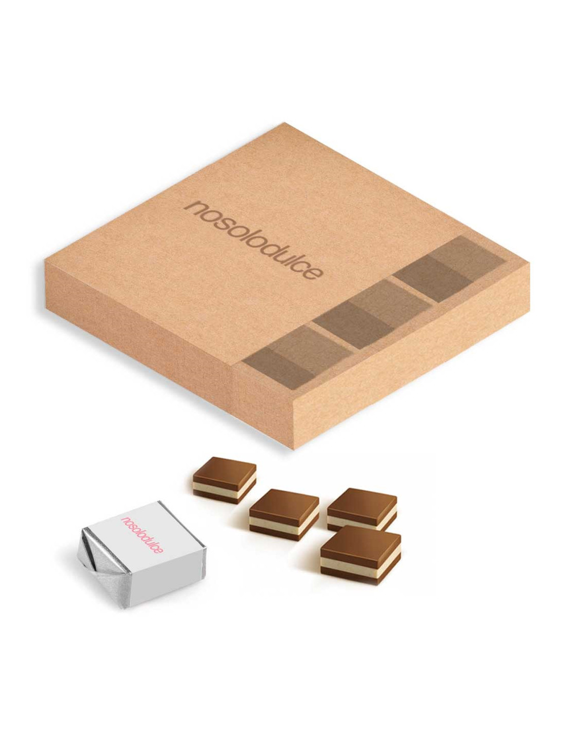 Delicioso bombón cortado presentado en cajas de cartón kraft de 9 cortados de medidas 12,2 x 12,2 cm. Fabricado por Chocolates Lacasa, nuestro bombón cortado está compuesto de 3 capas de chocolate de máxima calidad.