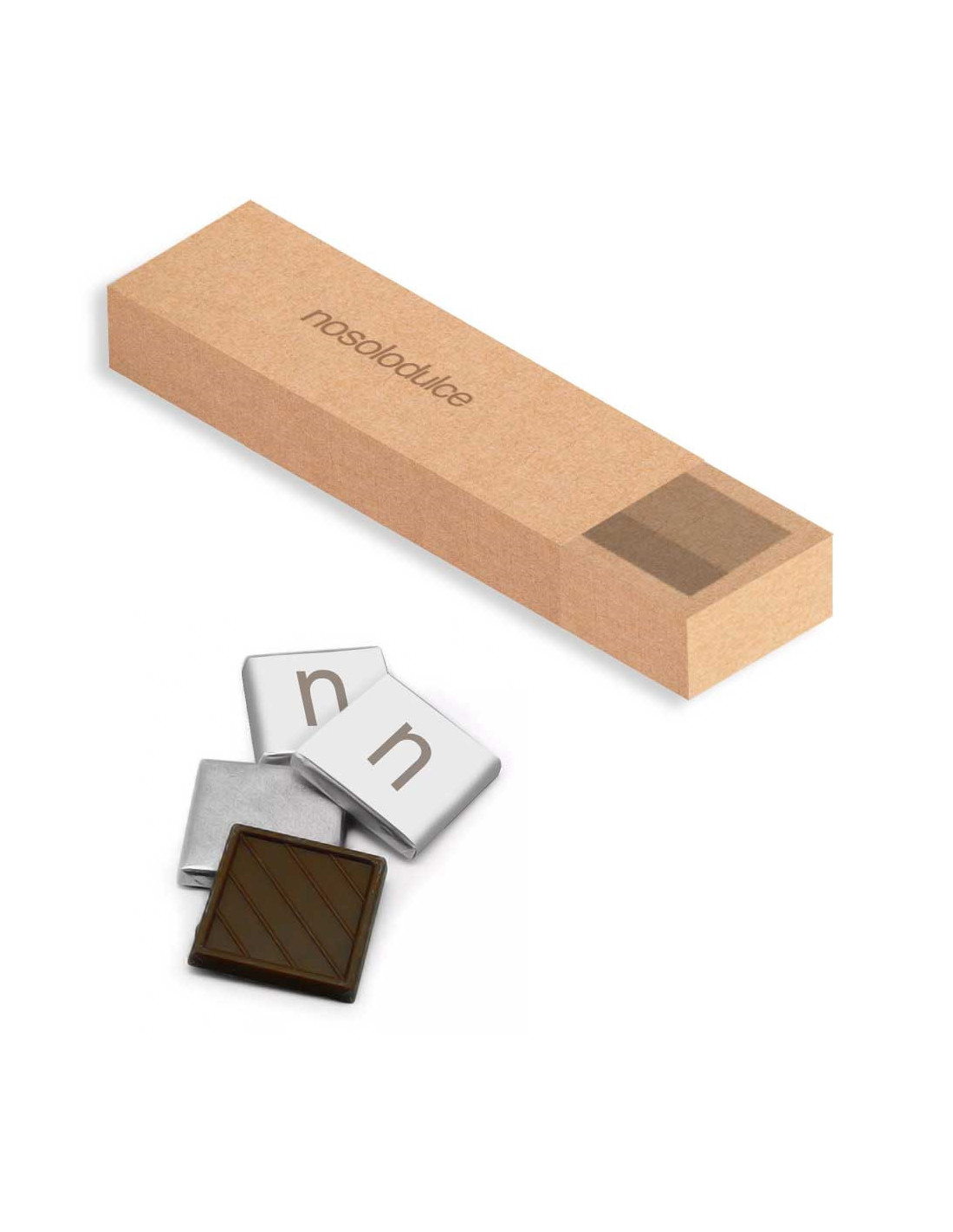 Caja alargada kraft de medidas 14 x 5,5 cm. Puedes escoger entre 4-8-16 napolitanas de chocolate con forma cuadrada.