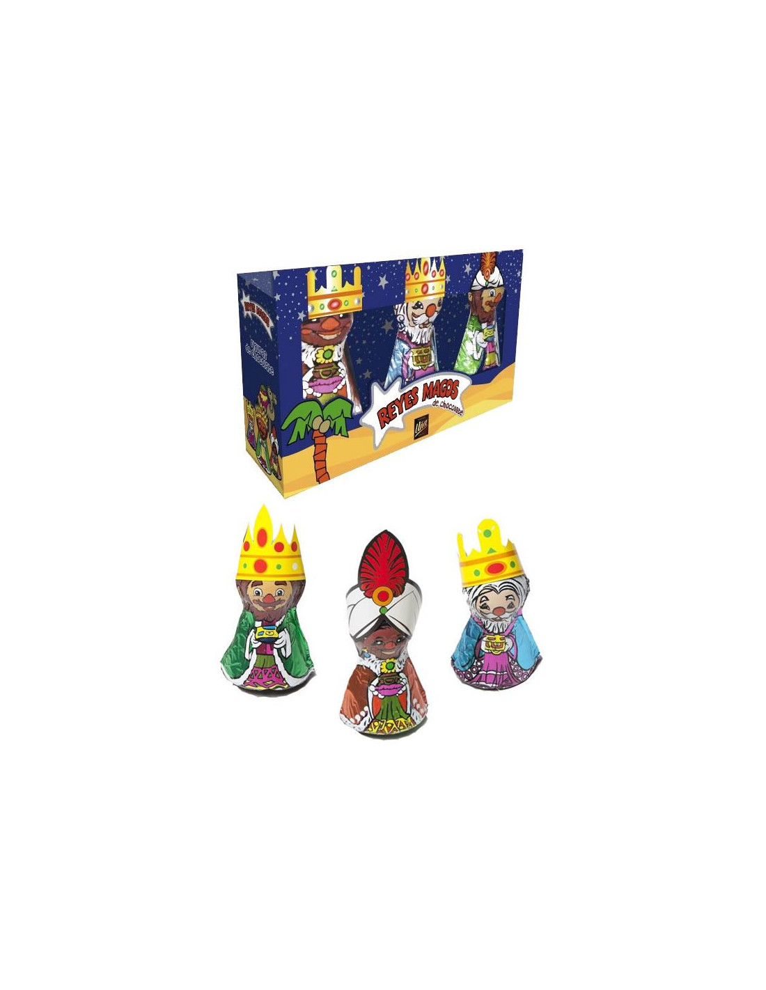 Simpáticas figuras de chocolate con leche huecas por dentro que representan a los reyes magos. Cada rey mide 10 cm x 3,5 cm aproximadamente. Vienen con coronas de cartón recortables en la parte trasera de la caja.