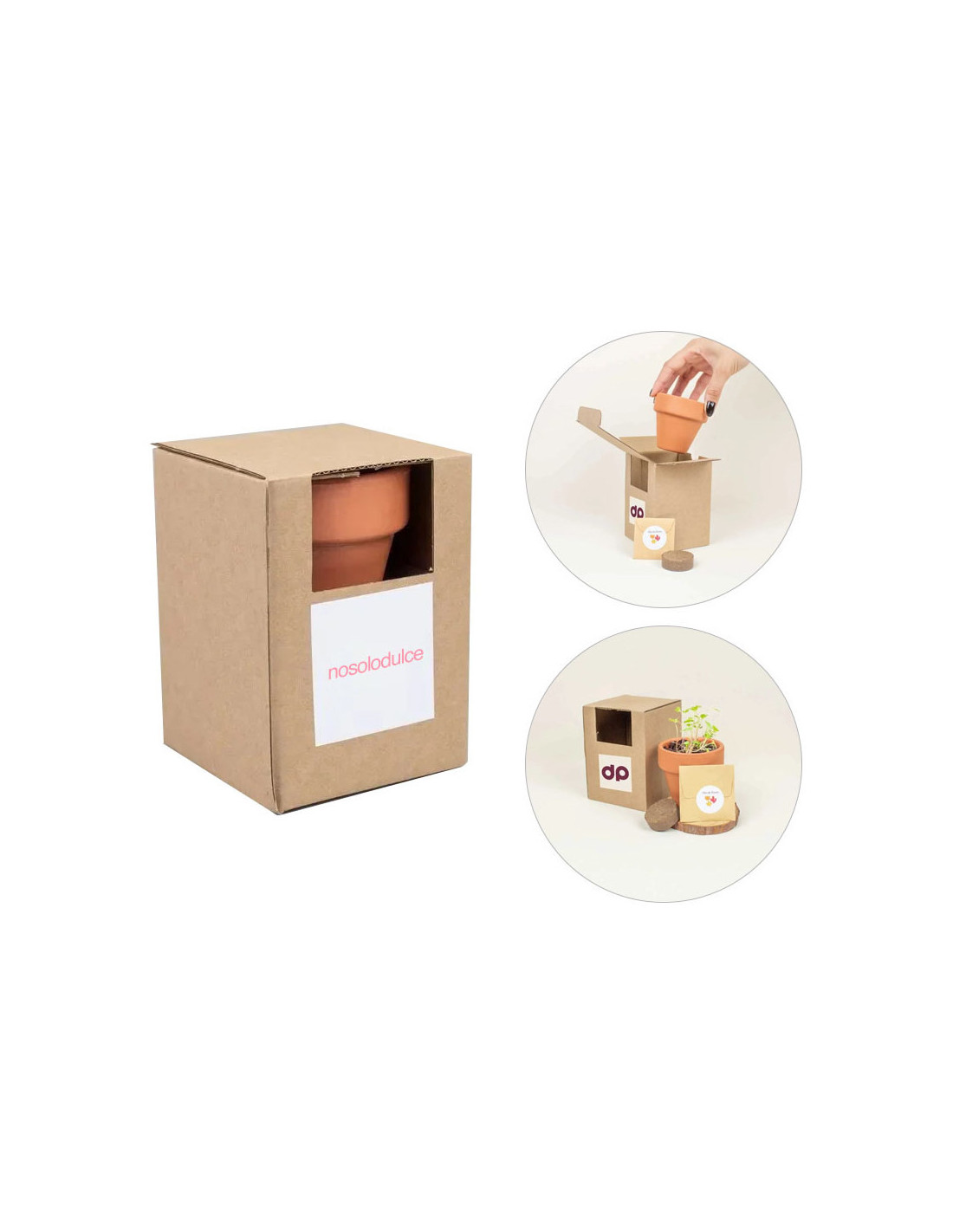 - Material: Maceta de terracota (sin agujero) // Pastilla de tierra deshidratada // Sobre con semillas cerrado con una pegatina // Caja de cartón microcanal con pegatina blanca.