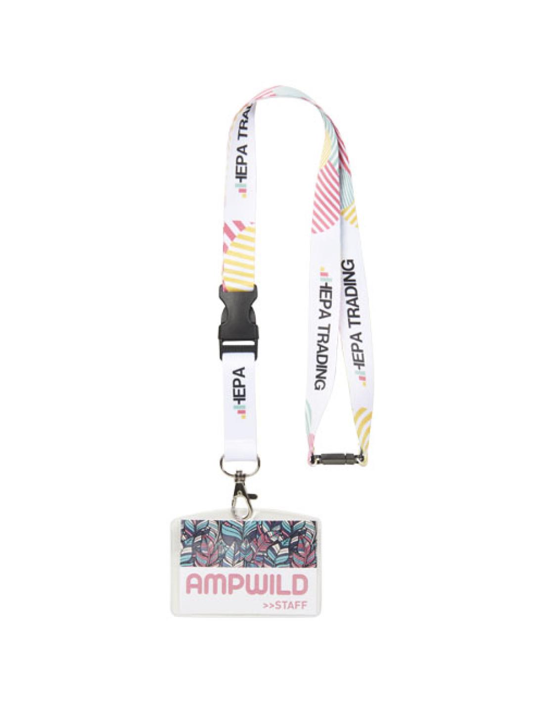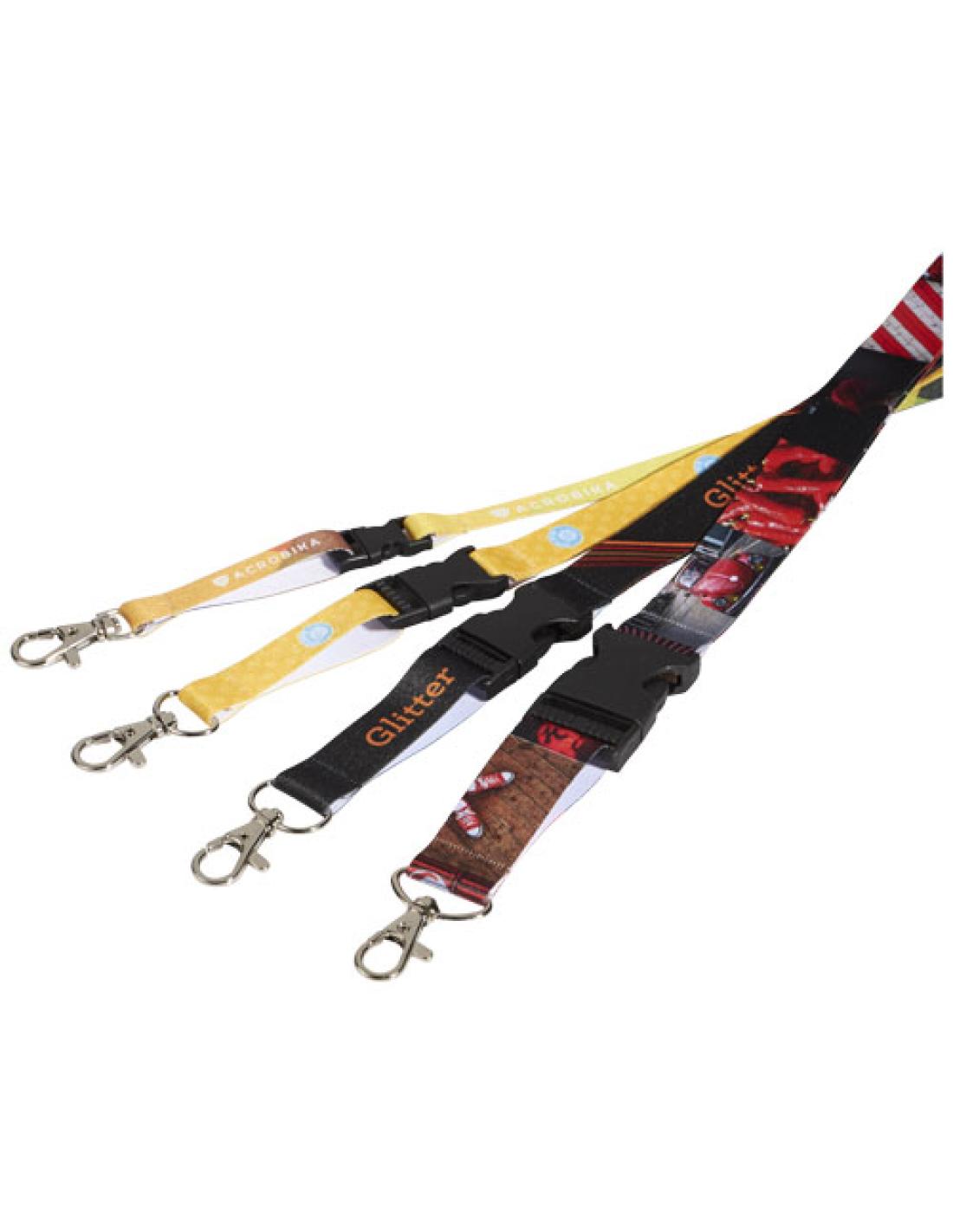 Lanyard Balta sublimado a todo color. La impresión está disponible a una o dos caras. Para la impresión a doble cara, puedes elegir entre la opción estándar o posicionada (posicionada significa que la impresión se alinea en ambas caras). El lanyard incluye un mosquetón metálico, hebilla de plástico y un cierre de seguridad para evitar riesgo de asfixia. Puede sujetar una tarjeta identificativa o unas llaves. Disponible en 4 anchuras de lado diferentes: 10, 15, 20 y 25 mm.