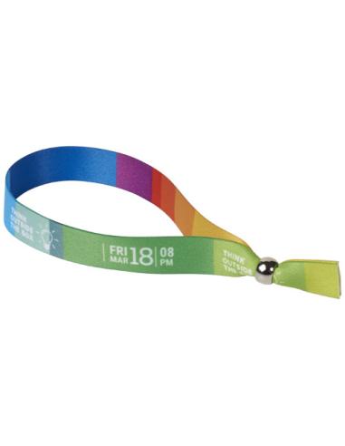 Pulsera Evi de sublimación a todo color con cierre extraíble. La impresión está disponible a una o dos caras. Para la impresión a doble cara, puede elegir entre la opción estándar o posicionada (posicionada significa que la impresión se alinea en ambas caras). El cierre extraíble permite quitarse la pulsera facilmente, lo que la convierte en la pulsera perfecta para fiestas infantiles y eventos en los que se desee utilizar las pulseras varias veces.