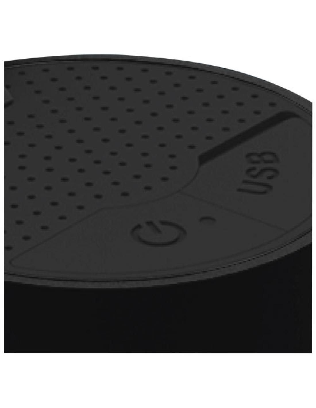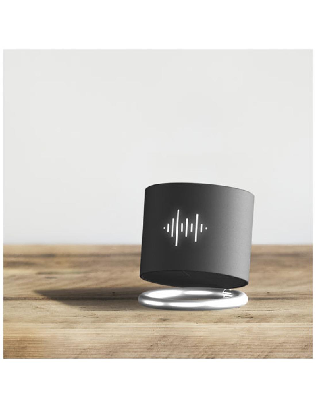 Altavoz inalámbrico de 3 W con Bluetooth® y logotipo retroiluminado con tratamiento antibacteriano. Doble salida de sonido para una calidad de sonido inigualable para un altavoz de este tamaño. El altavoz con anilla puede inclinarse para dirigir el sonido en cualquier dirección. Incorpora un micrófono y función de llamada en conferencia. Capacidad: Batería de 500 mAh - 3,7 V. Frecuencia: 50 Hz - 20 KHz. Salida de sonido: 1 × 3 W. Impedancia: 4 Ω. Bluetooth® 4.2. Peso neto: 100 gramos. Tamaño: ∅ 50 mm × 45 mm. Viene con una caja de regalo con cierre magnético, fabricada con papel reciclado.