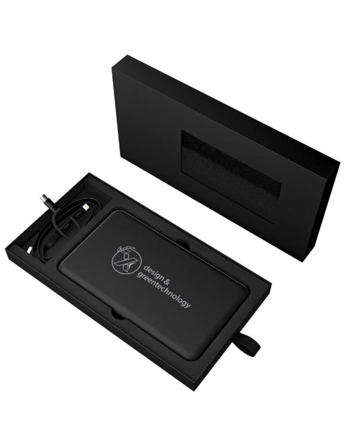 Batería externa solar de 5000 mAh de goma con logotipo retroiluminado. Se entrega con un cable de PET reciclado 3 en 1 (tipo C, Android y iPhone). La gran superficie del panel solar permite recargar la batería hasta 170 mAh/hora. La carga también se puede realizar a través del cable suministrado. En cuanto se toca la batería externa, el logotipo grabado se ilumina durante 30 segundos. También se mantiene encendido durante la carga. Se entrega con una caja de regalo fabricada con papel reciclado. Entrada: USB de 5 V/2A. Salida: 5 V/2 A. Tamaño: 125 × 72 × 11,8 mm.