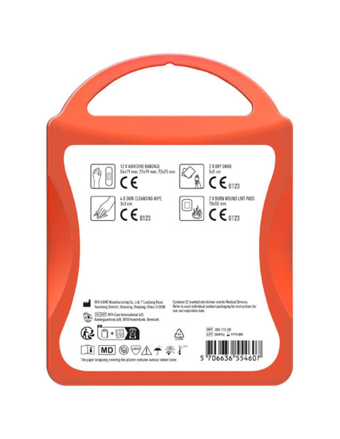 Kit de primeros auxilios básico para los viajeros. Con él estarás preparado para tratar cualquier pequeña herida durante tu viaje. Contenido: 12 apósitos adhesivos resistentes al agua, 4 toallitas limpiadoras, 2 toallitas secas, 2 gasas para quemaduras. Todos los complementos de primeros auxilios cumplen todas las normativas de la UE. El precio incluye impresión a todo color en la etiqueta.