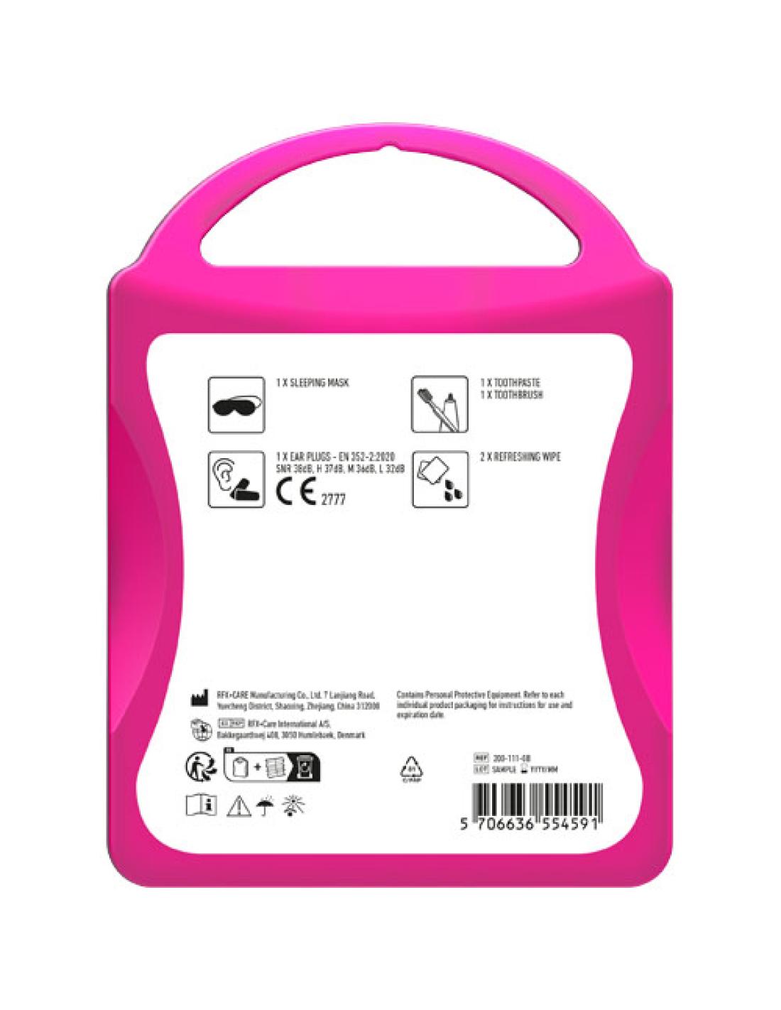 Kit ideal para todo viaje. Con este kit podrás relajarte y refrescarte antes de llegar a tu destino. Contenido: 1 antifaz, 2 tapones oídos, 2 toallitas refrescantes. Todos los complementos de primeros auxilios cumplen todas las normativas de la UE. El precio incluye impresión a todo color en la etiqueta.