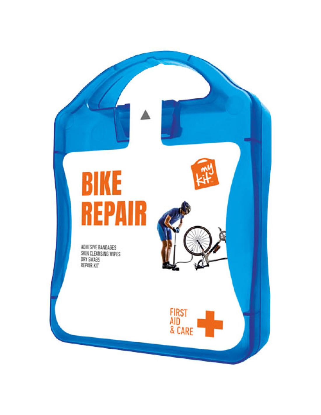 Kit ideal para cualquier usuario de bicicleta. Con este kit estarás preparado para pequeños accidentes y pinchazos en las ruedas. Contenido: 12 apósitos adhesivos resistentes al agua, 4 toallitas limpiadoras, 2 toallitas secas, 1 kit de reparación. Todos los complementos de primeros auxilios cumplen todas las normativas de la UE. El precio incluye impresión a todo color en la etiqueta.