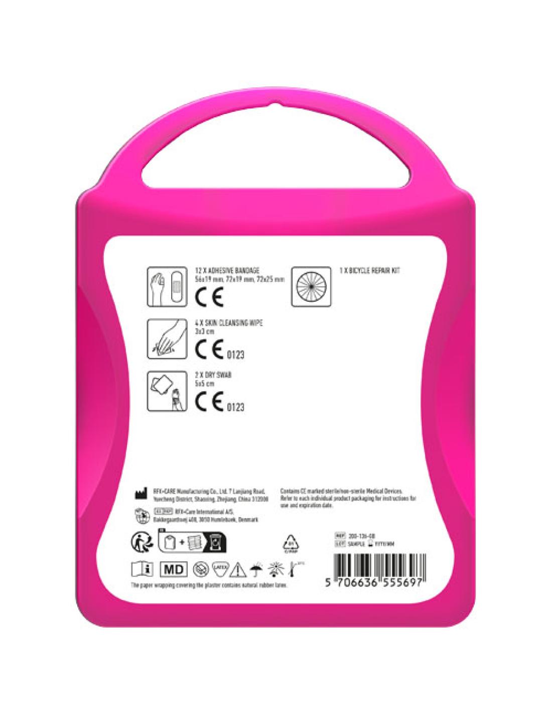 Kit ideal para cualquier usuario de bicicleta. Con este kit estarás preparado para pequeños accidentes y pinchazos en las ruedas. Contenido: 12 apósitos adhesivos resistentes al agua, 4 toallitas limpiadoras, 2 toallitas secas, 1 kit de reparación. Todos los complementos de primeros auxilios cumplen todas las normativas de la UE. El precio incluye impresión a todo color en la etiqueta.