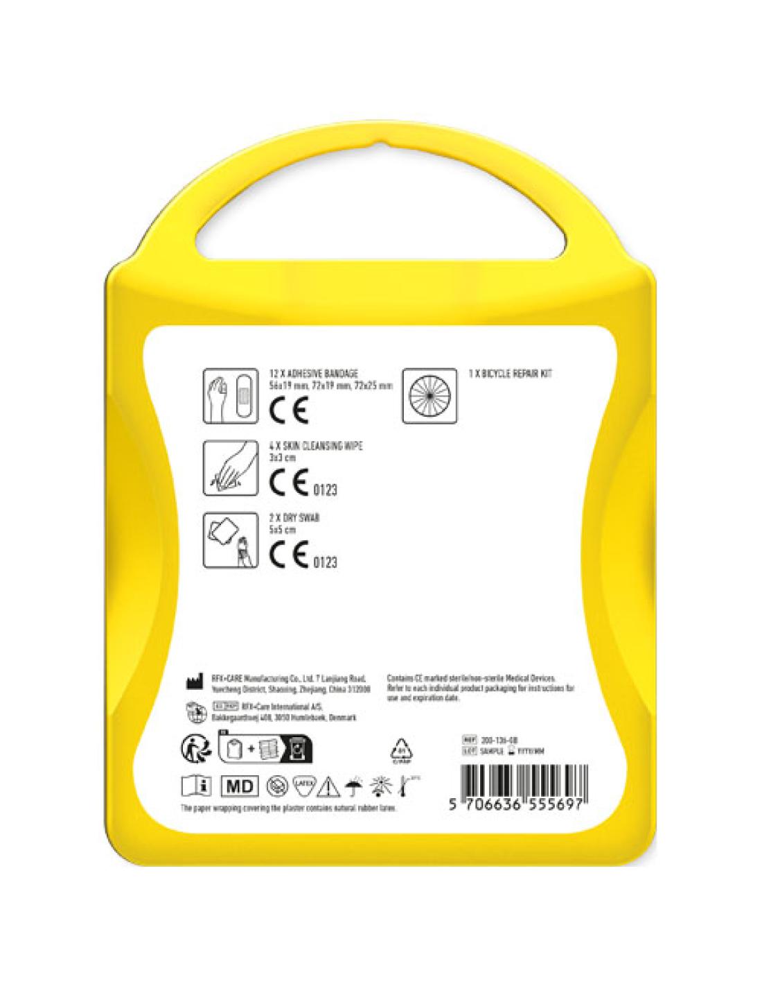 Kit ideal para cualquier usuario de bicicleta. Con este kit estarás preparado para pequeños accidentes y pinchazos en las ruedas. Contenido: 12 apósitos adhesivos resistentes al agua, 4 toallitas limpiadoras, 2 toallitas secas, 1 kit de reparación. Todos los complementos de primeros auxilios cumplen todas las normativas de la UE. El precio incluye impresión a todo color en la etiqueta.