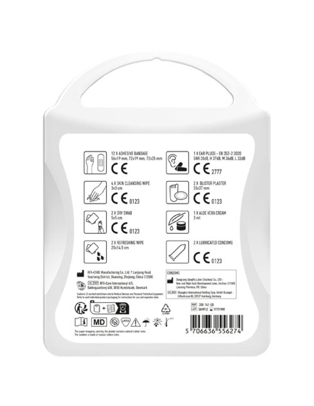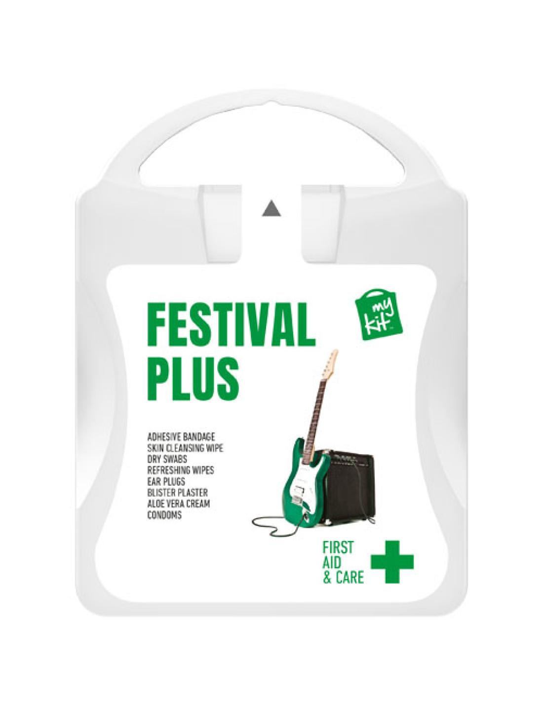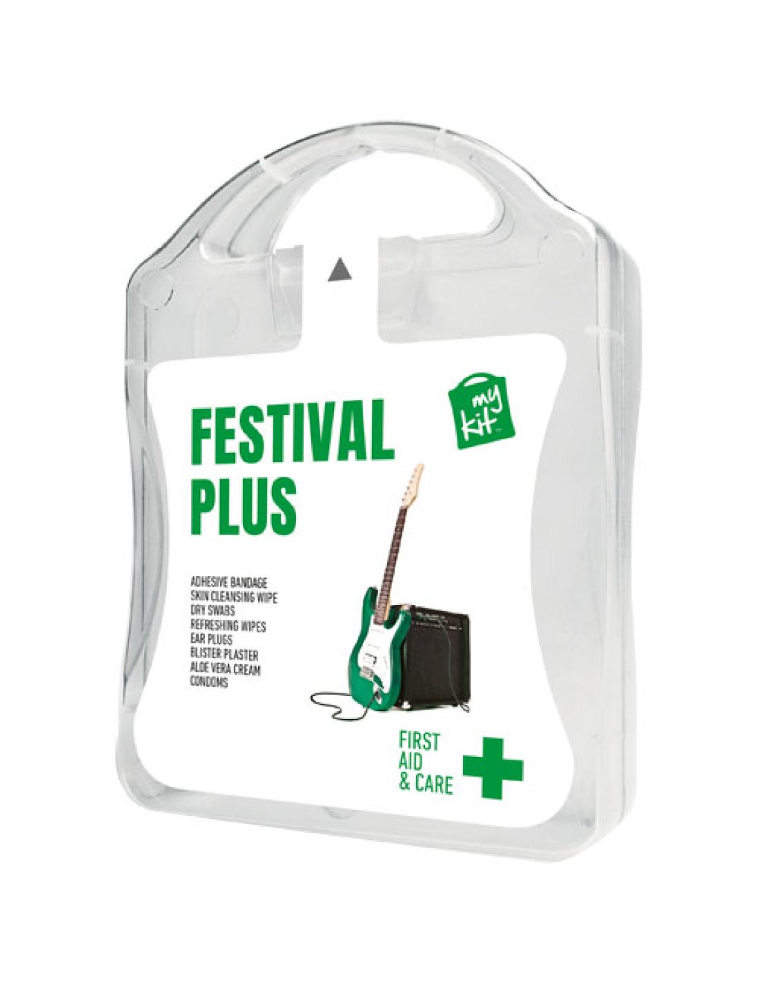 Kit ideal para cualquier festival. Con este kit estarás preparado para cualquier momento del festival. Contenido: 12 apósitos adhesivos resistentes al agua, 4 toallitas limpiadoras, 2 toallitas secas, 2 toallitas refrescantes, 2 preservativos, 2 adhesivos para ampollas, 1 crema aloe vera, 2 tapones oídos. Todos los complementos de primeros auxilios cumplen todas las normativas de la UE. El precio incluye impresión a todo color en la etiqueta.