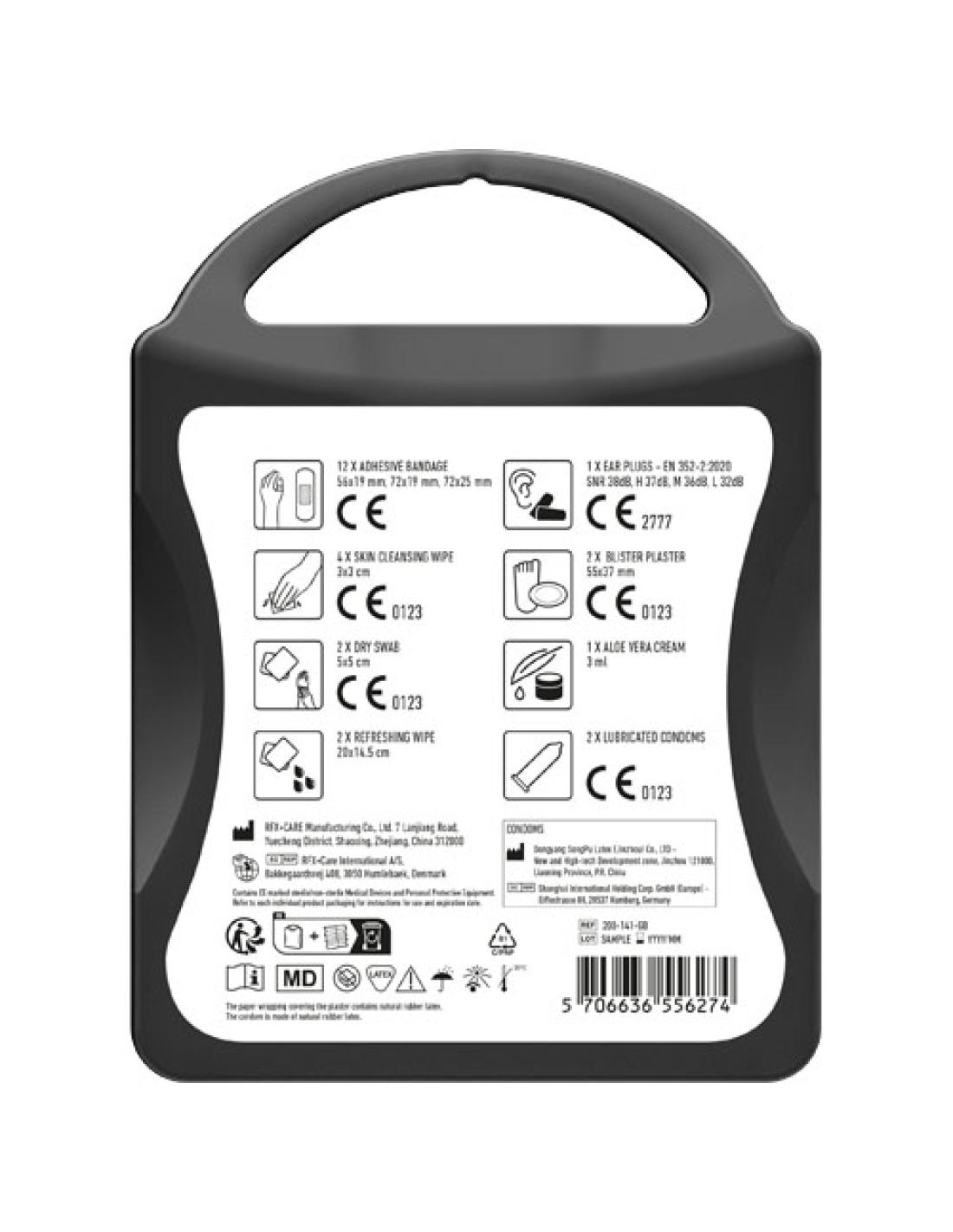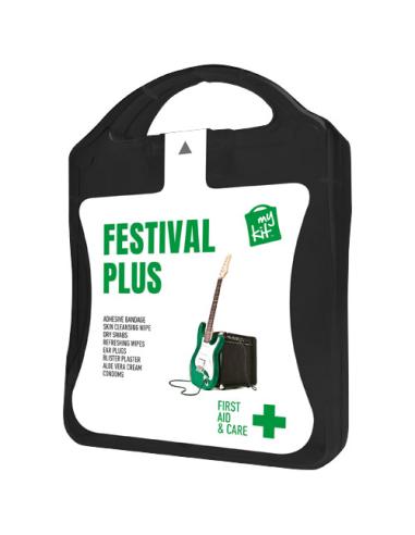 Kit ideal para cualquier festival. Con este kit estarás preparado para cualquier momento del festival. Contenido: 12 apósitos adhesivos resistentes al agua, 4 toallitas limpiadoras, 2 toallitas secas, 2 toallitas refrescantes, 2 preservativos, 2 adhesivos para ampollas, 1 crema aloe vera, 2 tapones oídos. Todos los complementos de primeros auxilios cumplen todas las normativas de la UE. El precio incluye impresión a todo color en la etiqueta.
